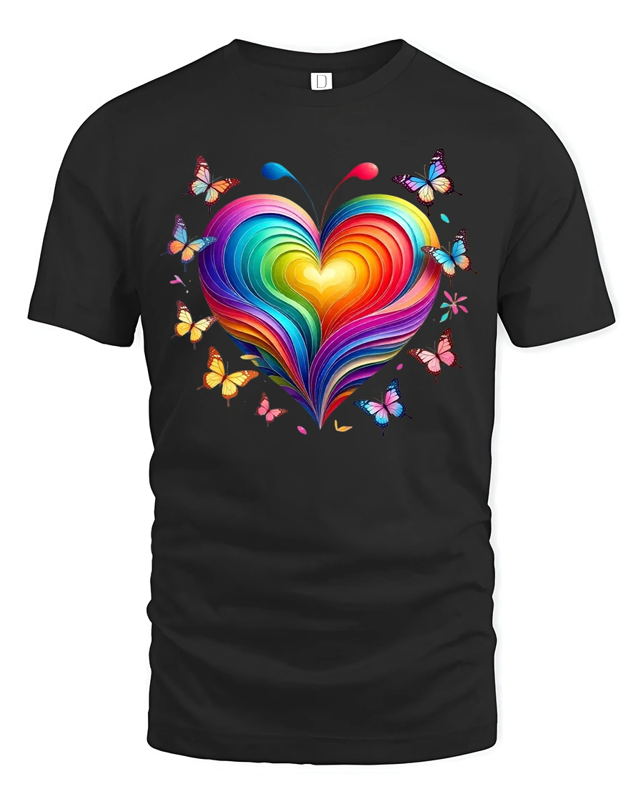 Celebrate color, beauty and self expression with a tee that blends comfort, artistry and glowing rainbow style. This vibrant heart and butterfly design brings happiness, charm and bright energy wherever you go.