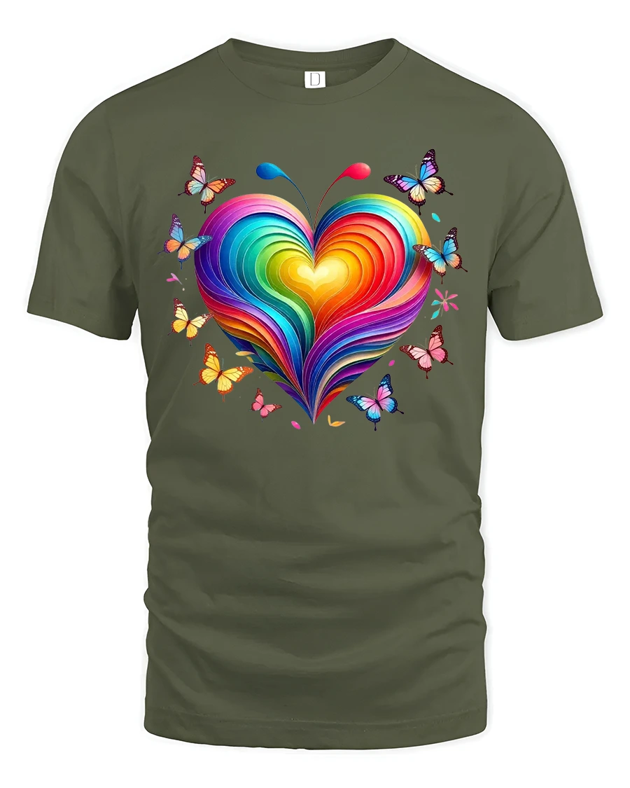 Colorful Heart Butterfly Tee with Vibrant Rainbow Art Style - military green t-shirt on white background