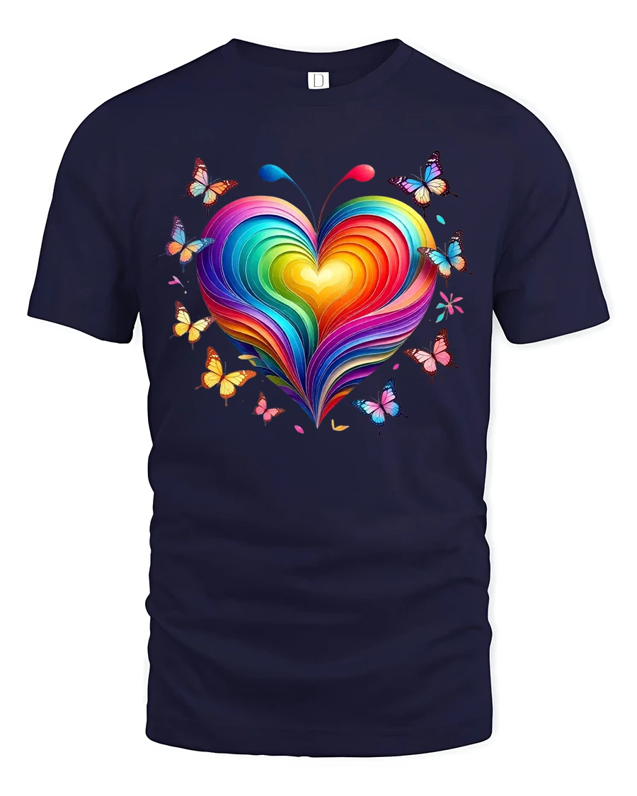 Colorful Heart Butterfly Tee with Vibrant Rainbow Art Style - navy t-shirt on white background