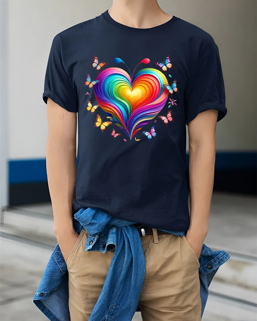 Colorful Heart Butterfly Tee with Vibrant Rainbow Art Style - model wearing navy tee with hands in pockets