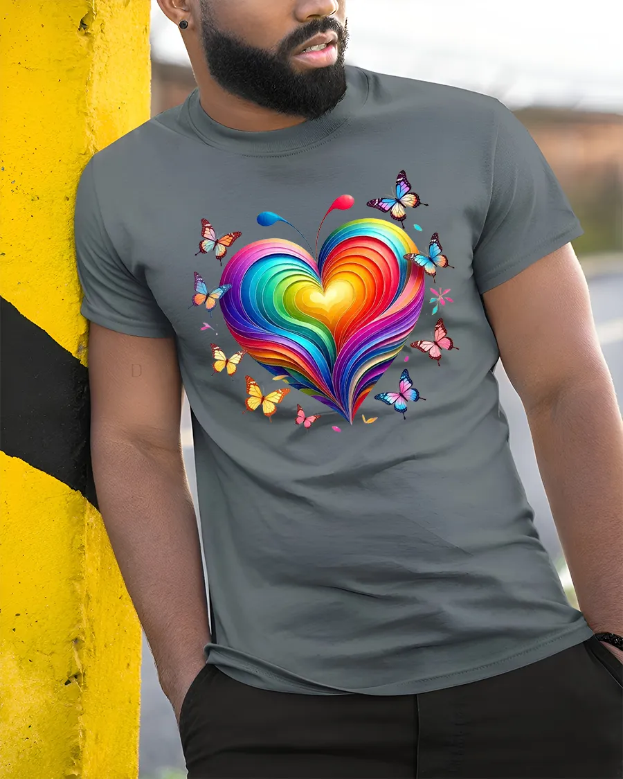 Colorful Heart Butterfly Tee with Vibrant Rainbow Art Style - model wearing grey tee, leaning on column