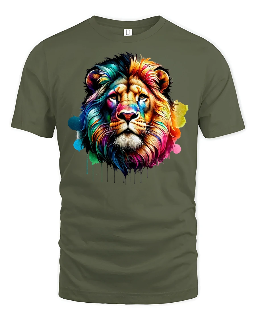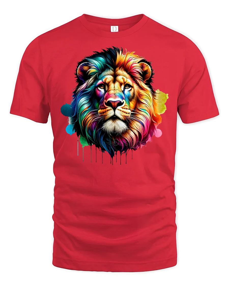 This bold and eye-catching tee features a majestic lion head painted in an explosion of bright rainbow colors, symbolizing courage and individuality.