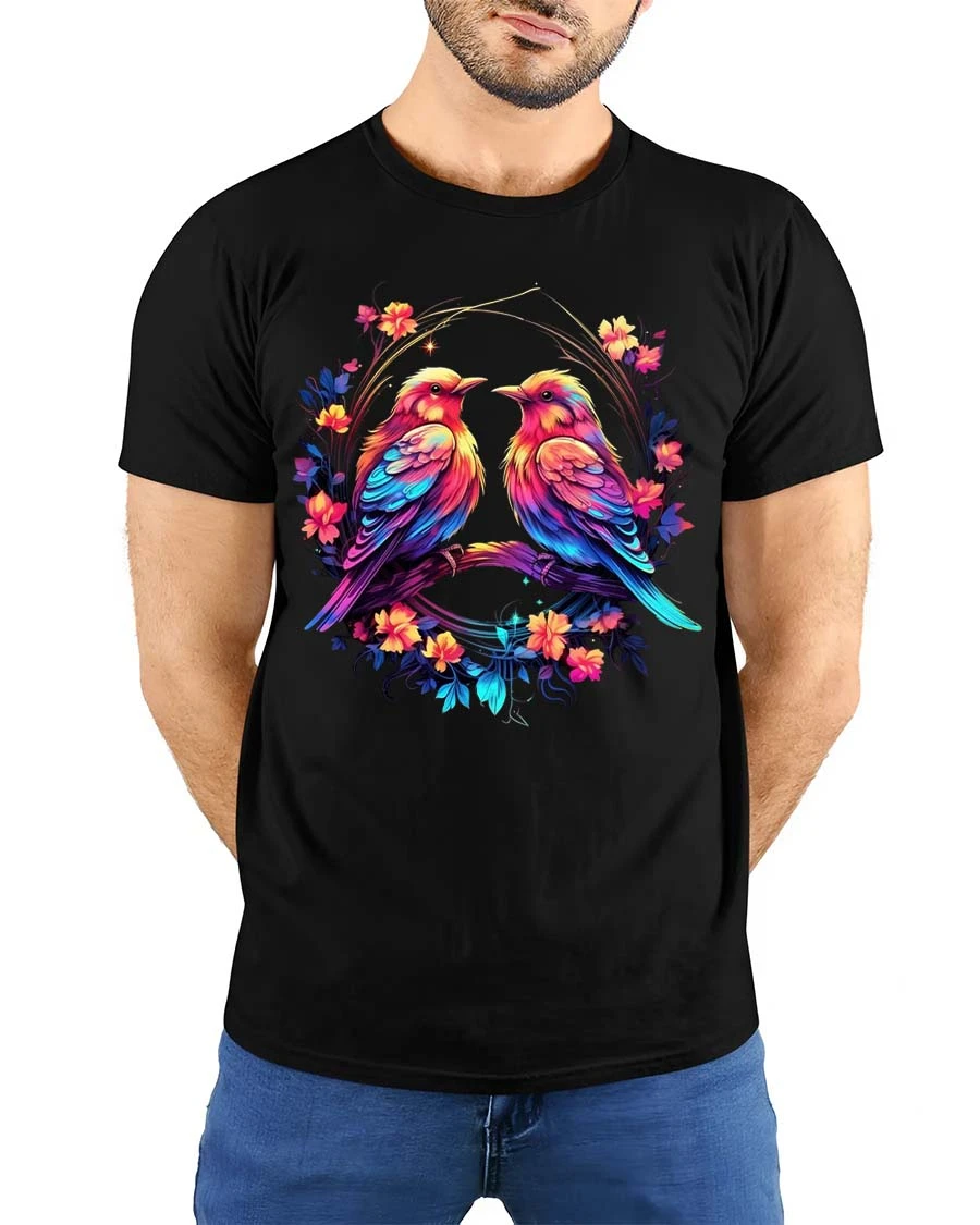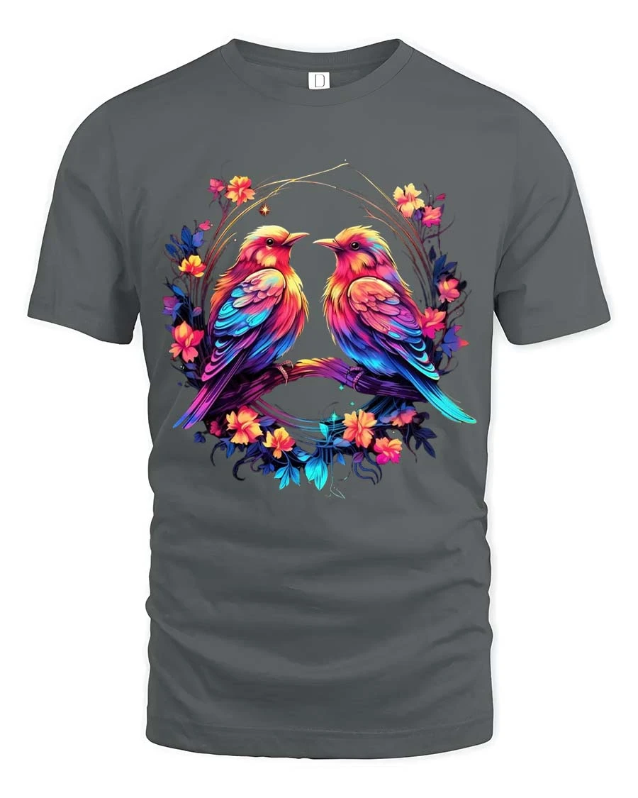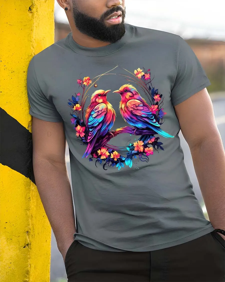 Colorful Love Birds Floral Circle Art Graphic T Shirt brings a beautiful blend of romance and nature into a vibrant artistic design.