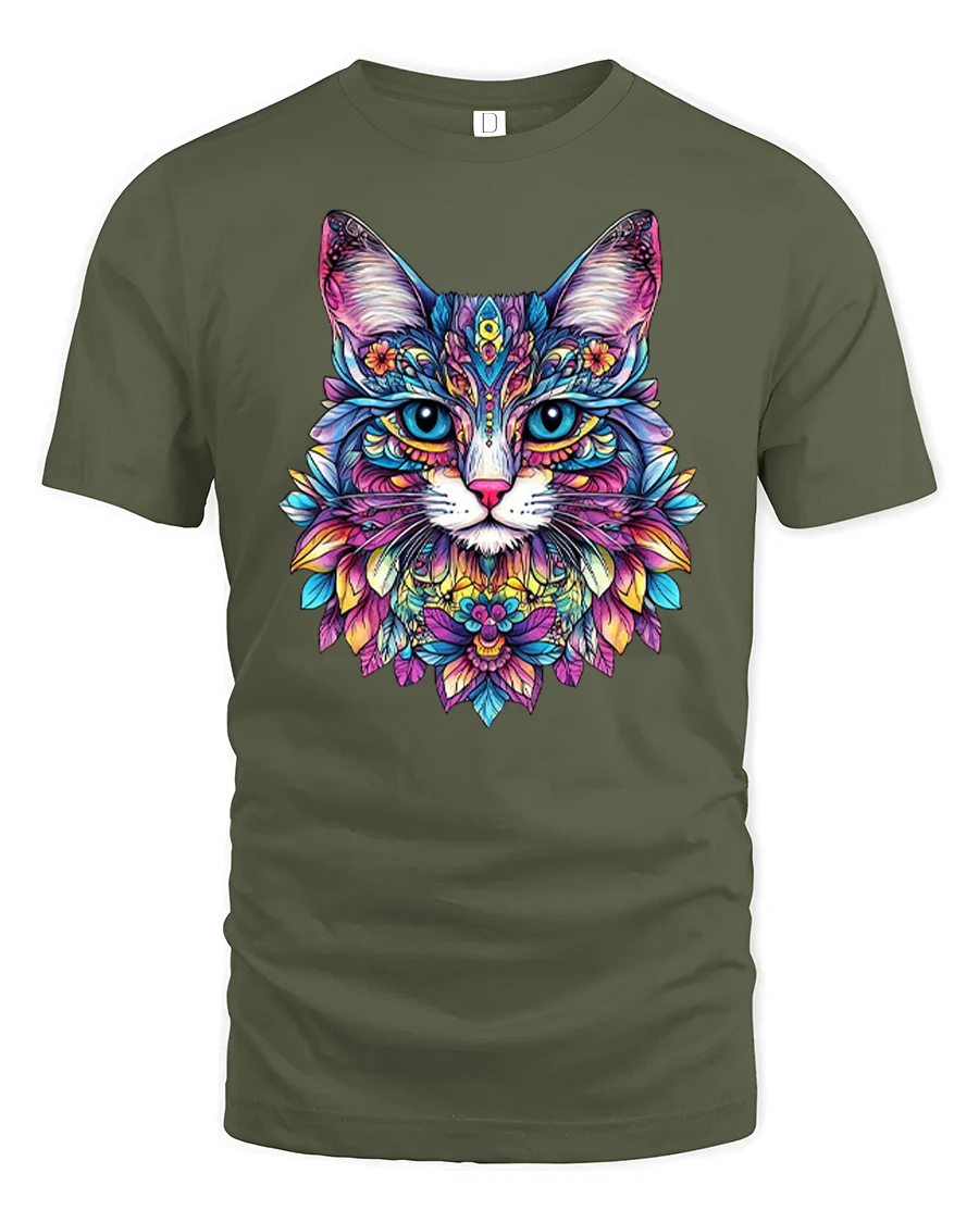 Colorful Mandala Cat Art Psychedelic Floral Graphic Tee showcases a stunning fusion of feline beauty and intricate mandala design.