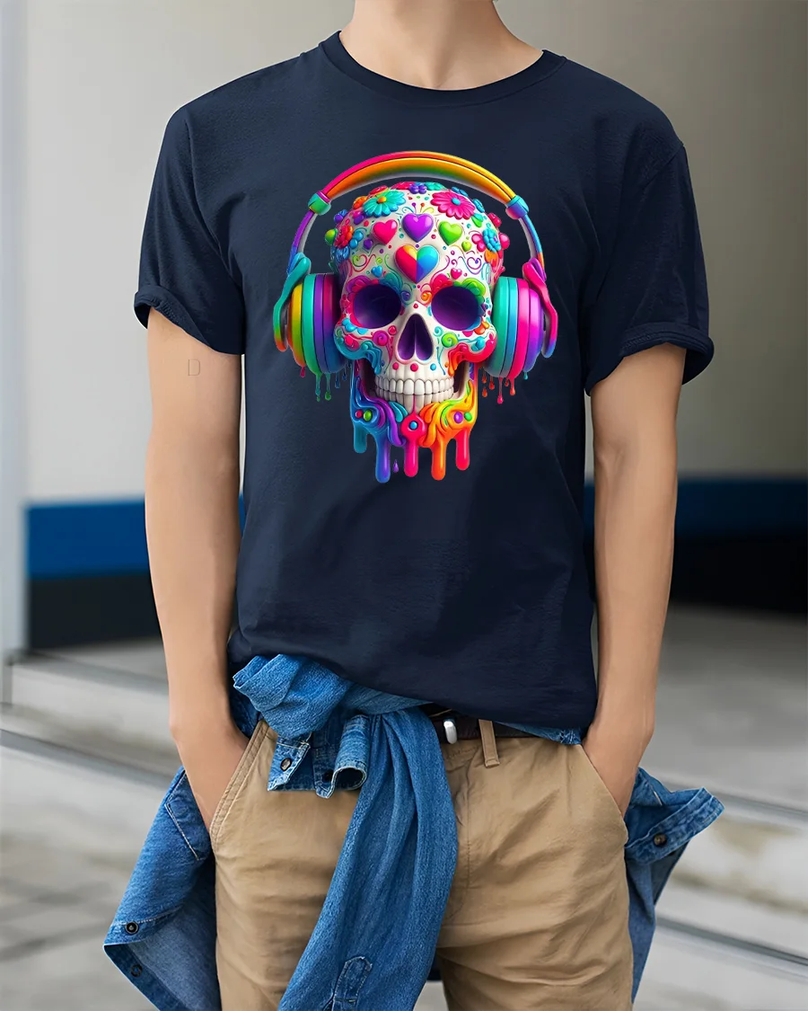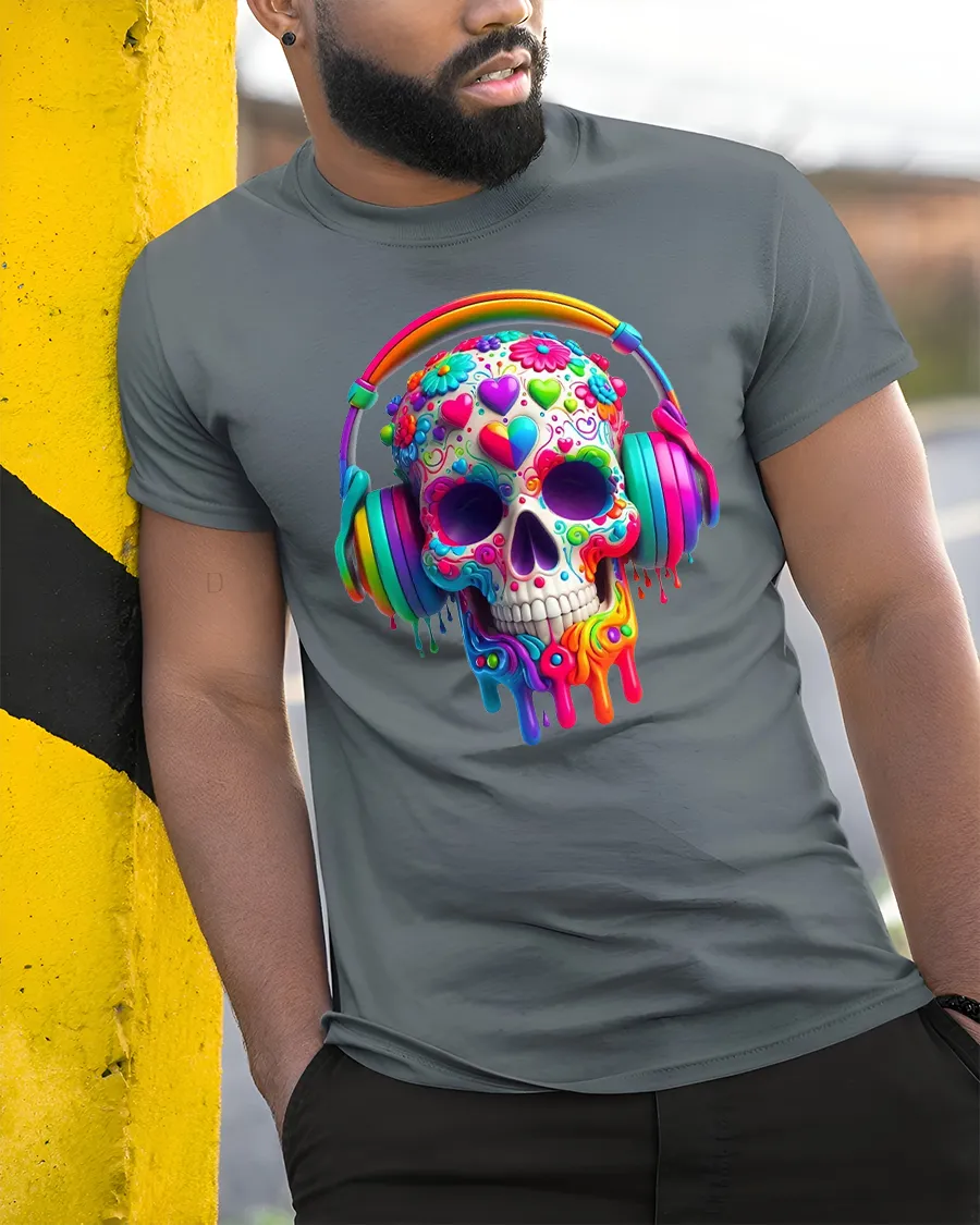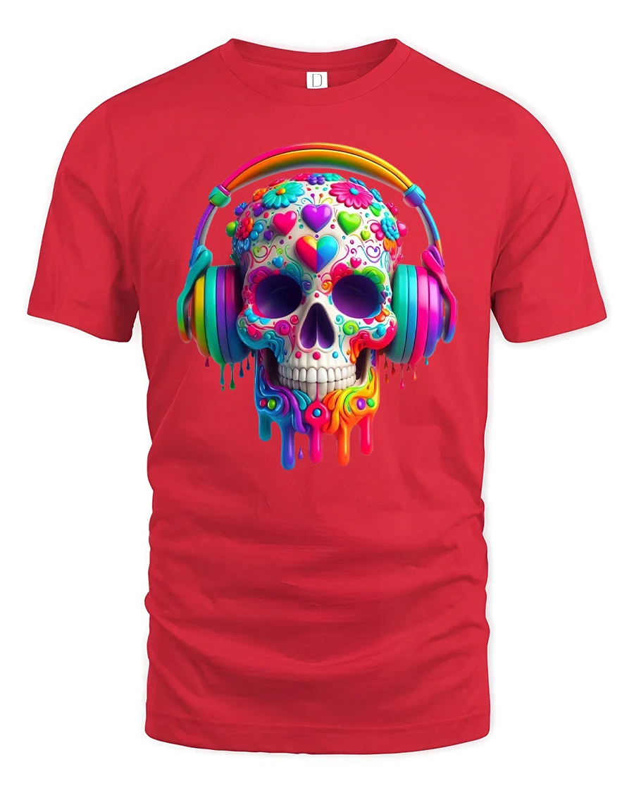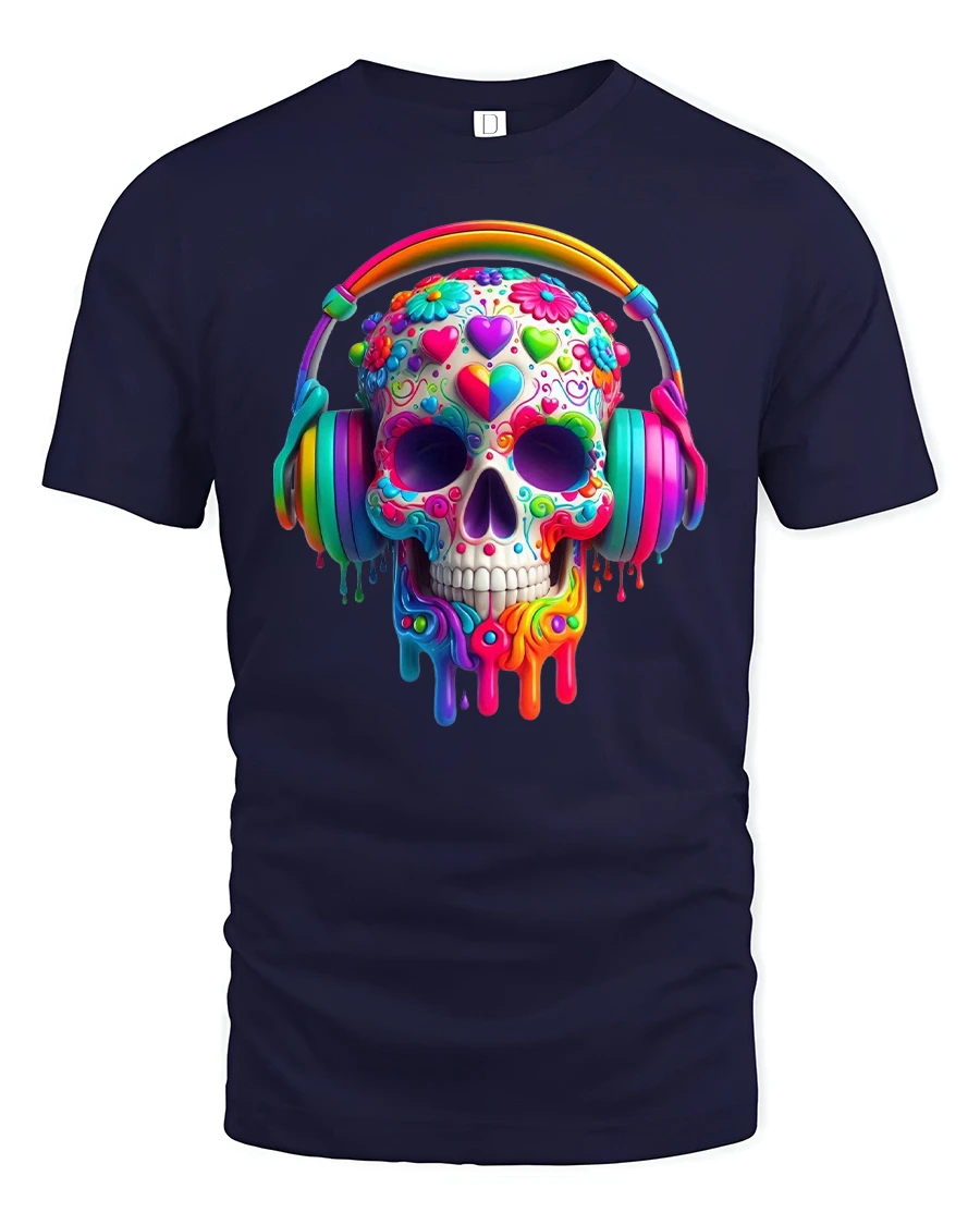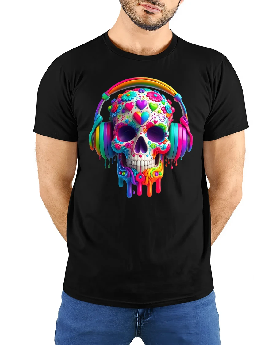Colorful Music Skull Tee with Headphones Dripping Art Design brings together bold creativity and vibrant energy, making it the perfect choice for music lovers who want to stand out. This eye-catching t-shirt features a neon skull wearing bright headphones, surrounded by dripping rainbow colors and psychedelic patterns that create a striking visual statement. Every detail is crafted to appeal to fans of EDM, DJs, festivals, and unique streetwear fashion.