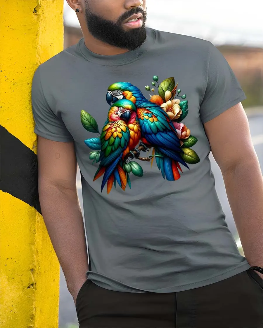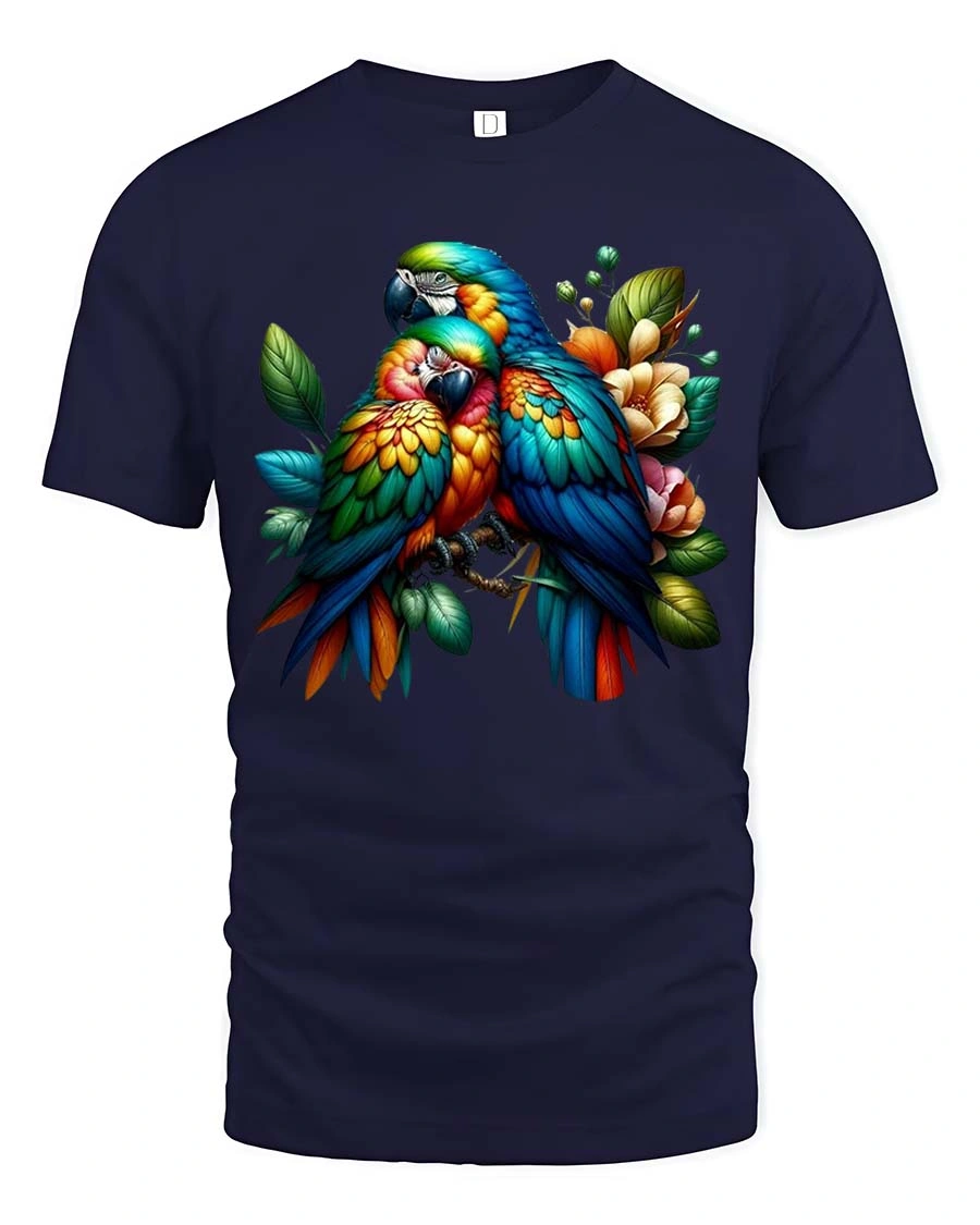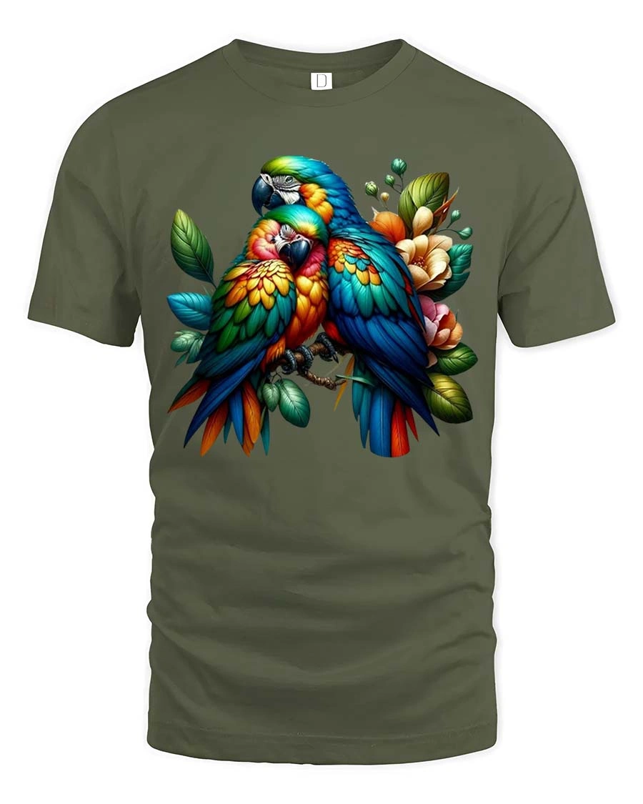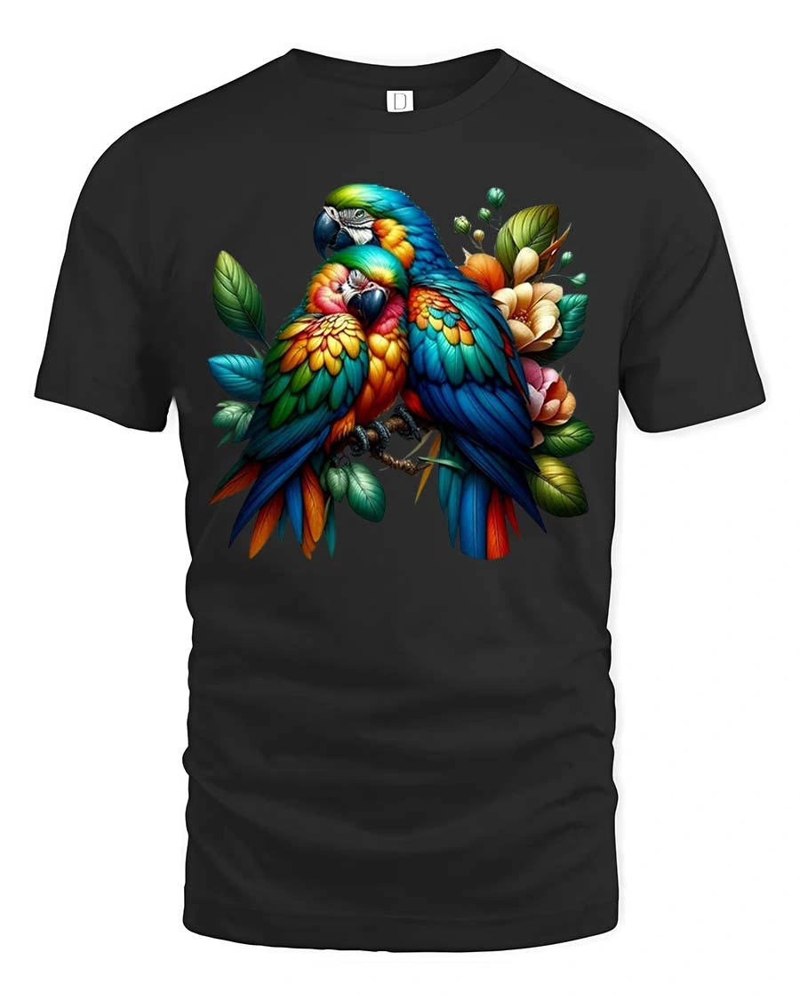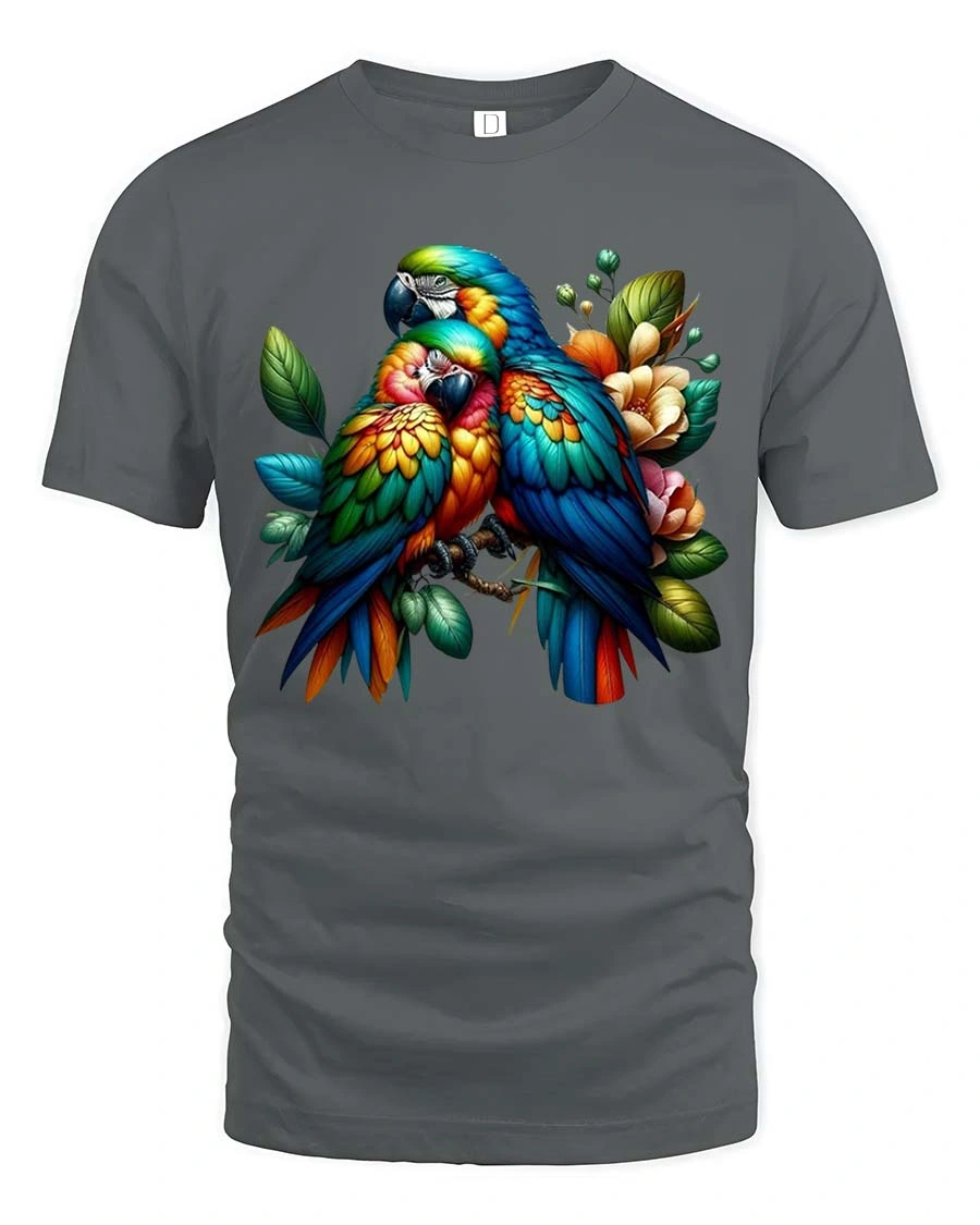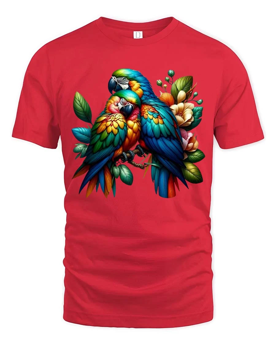 Colorful Parrot Couple T Shirt Tropical Birds Floral Graphic Tee showcases a stunning pair of vibrant parrots perched among lush leaves and flowers.
