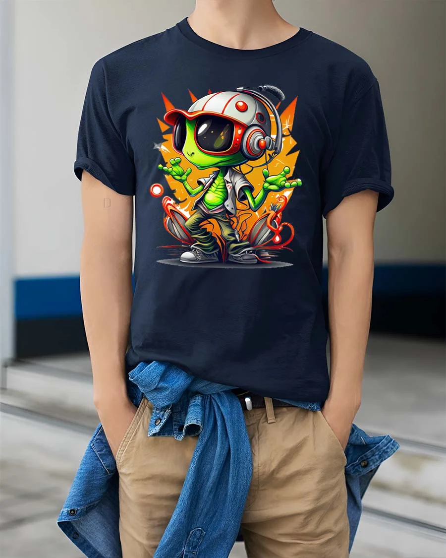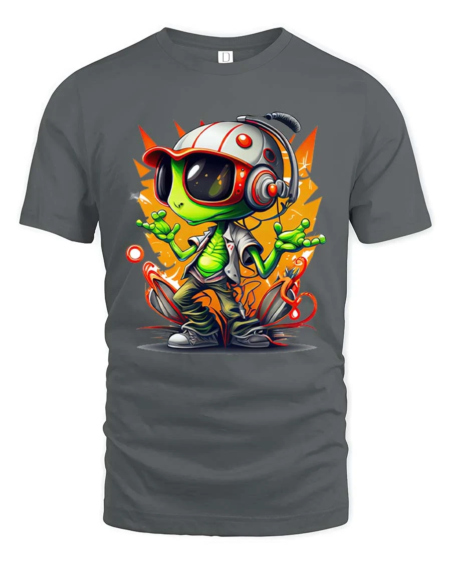 Cool Alien DJ Graphic T-Shirt Neon Space Vibes Tee brings a bold and futuristic look with a fun alien character rocking headphones and street style energy.