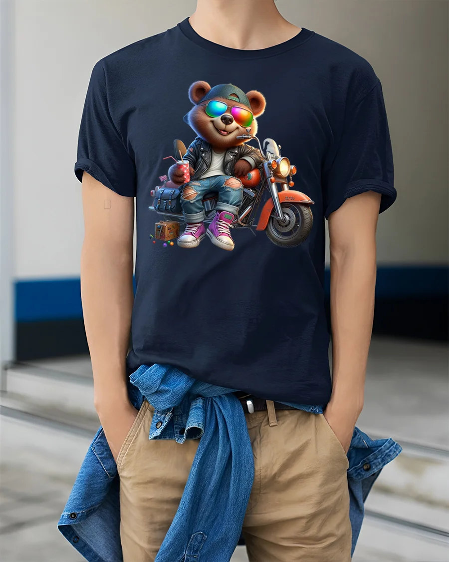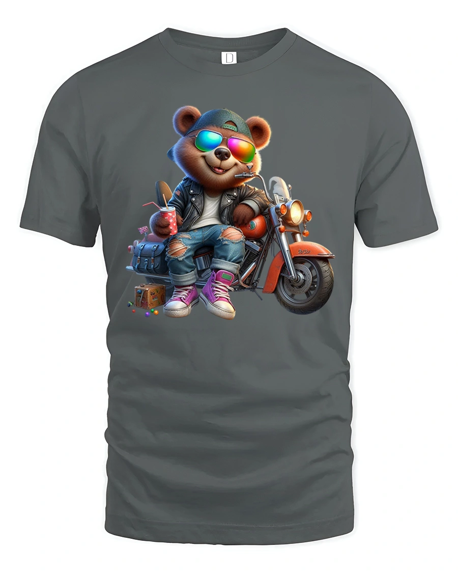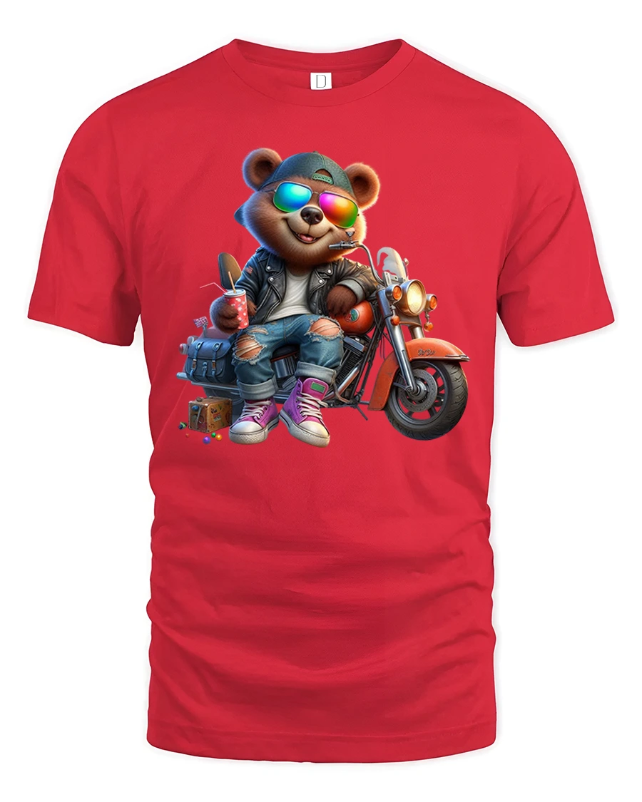This awesome tee features a laid-back bear rocking a leather jacket, rainbow shades, and a powerful motorbike — the ultimate mix of humor and coolness.