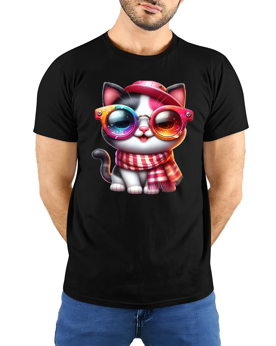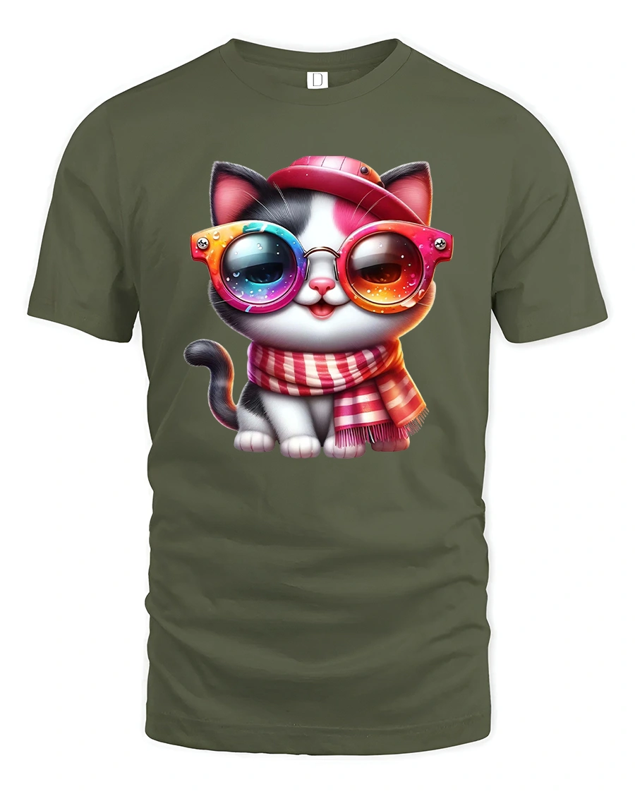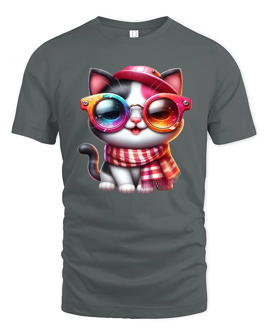 This design features an adorable cat wearing oversized rainbow sunglasses, a red cap, and a cozy scarf — full of charm and attitude.