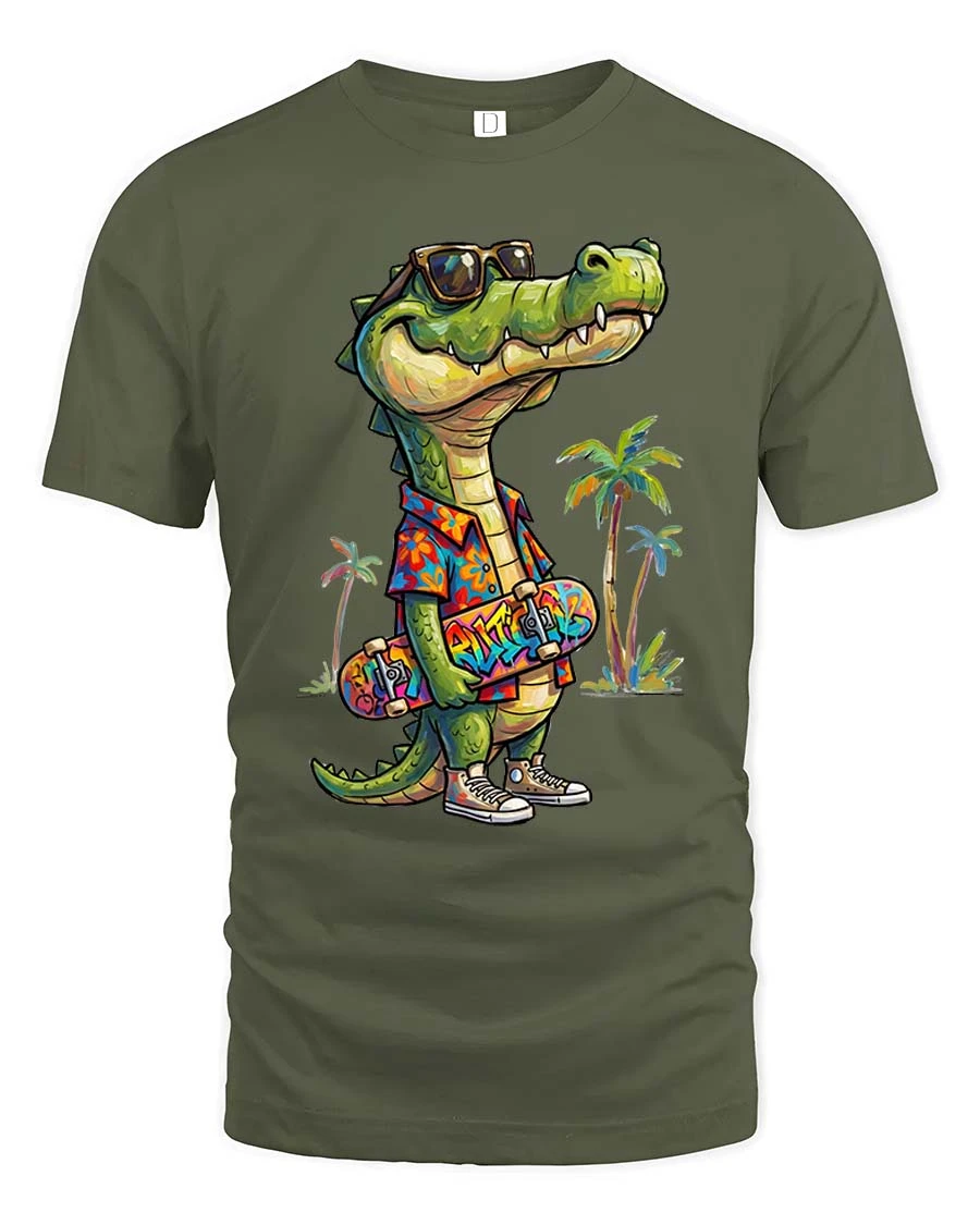 Cool Crocodile Skater Summer Vibes Graphic T Shirt Style - military green t-shirt on white background