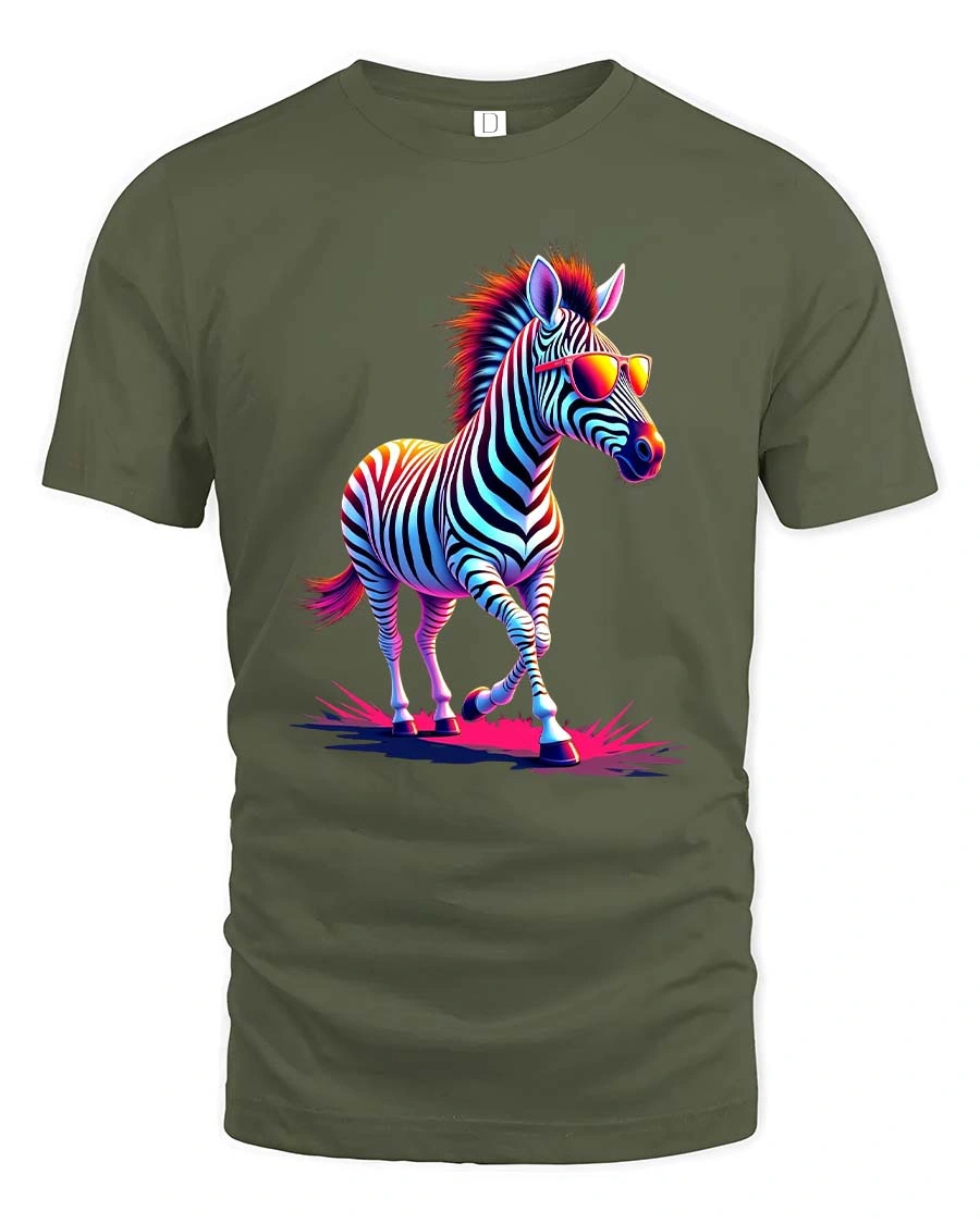 Cool Neon Zebra With Sunglasses Graphic T Shirt Retro Style - military green t-shirt on white background