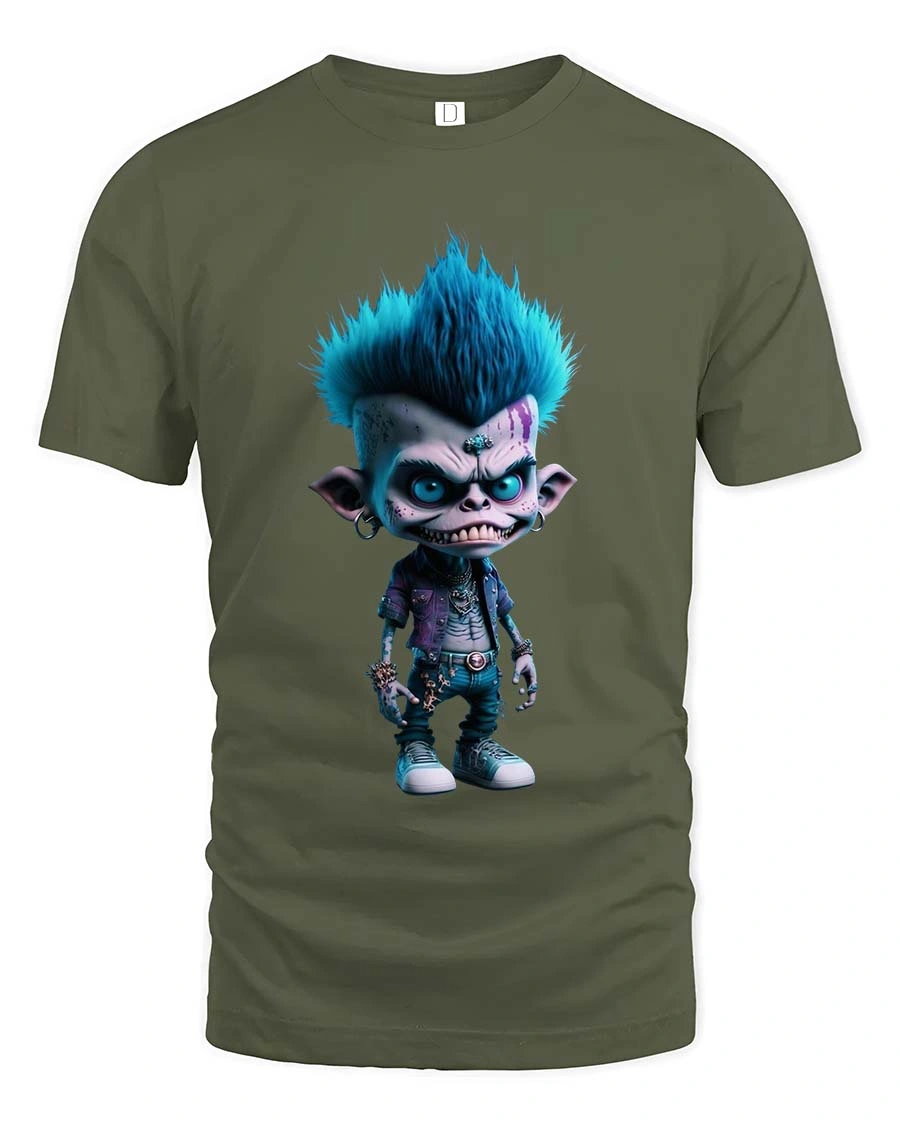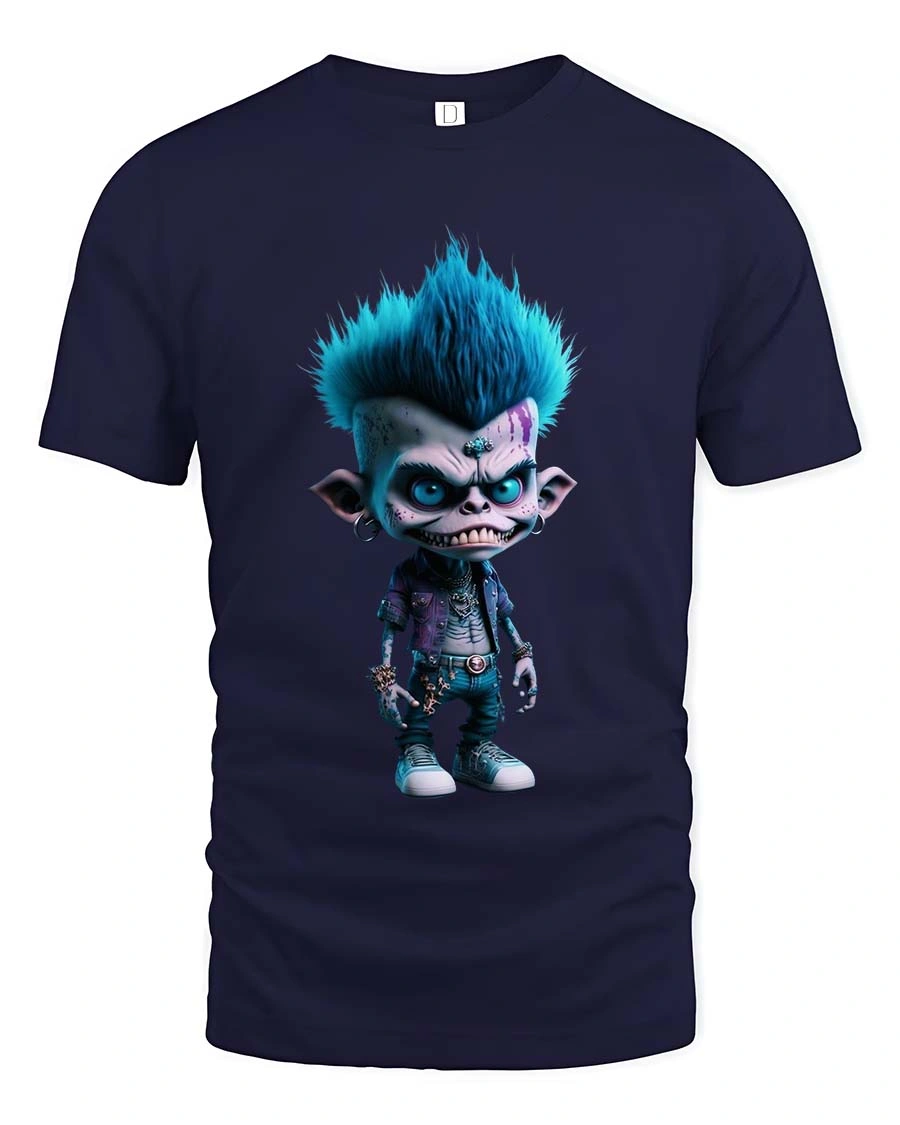 The rebellious punk monster stands out with its bold personality, creating a striking graphic that adds attitude and artistic flair to any casual outfit.