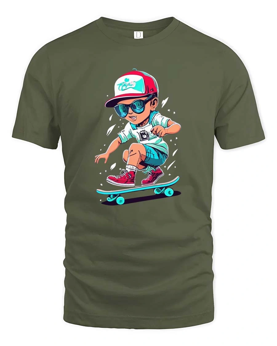 Cool Skateboarding Kid Cartoon Street Style Graphic T Shirt - military green t-shirt on white background