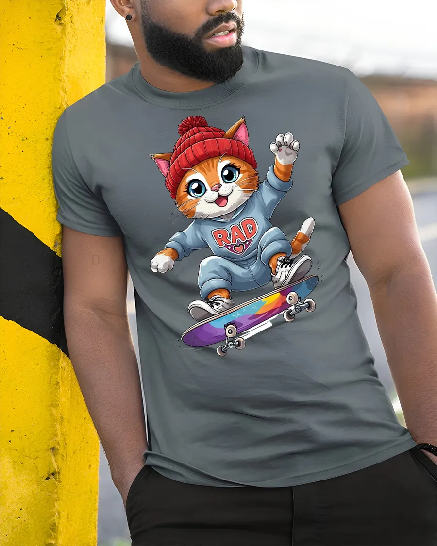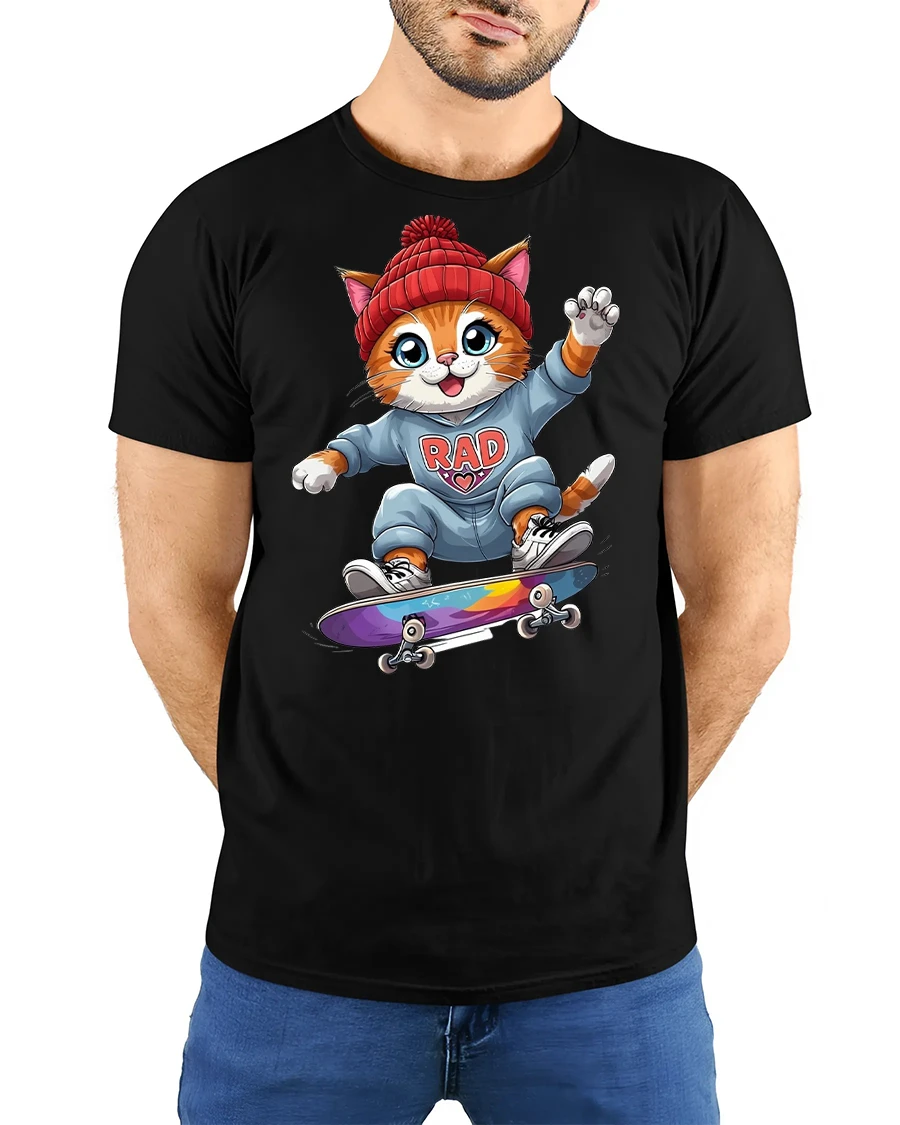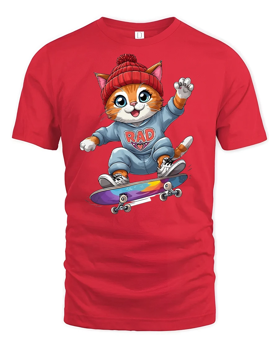 Show off your playful side with the Cool Skater Cat Cartoon Graphic T-Shirt for Adults, a fun and stylish piece designed for cat lovers and skateboarding fans alike. This tee features an adorable cartoon kitty rocking a red beanie and pulling off a rad trick on a colorful skateboard, making it the perfect blend of cute and cool.