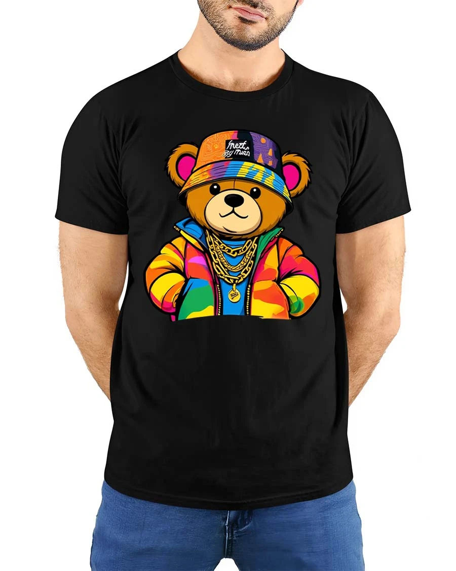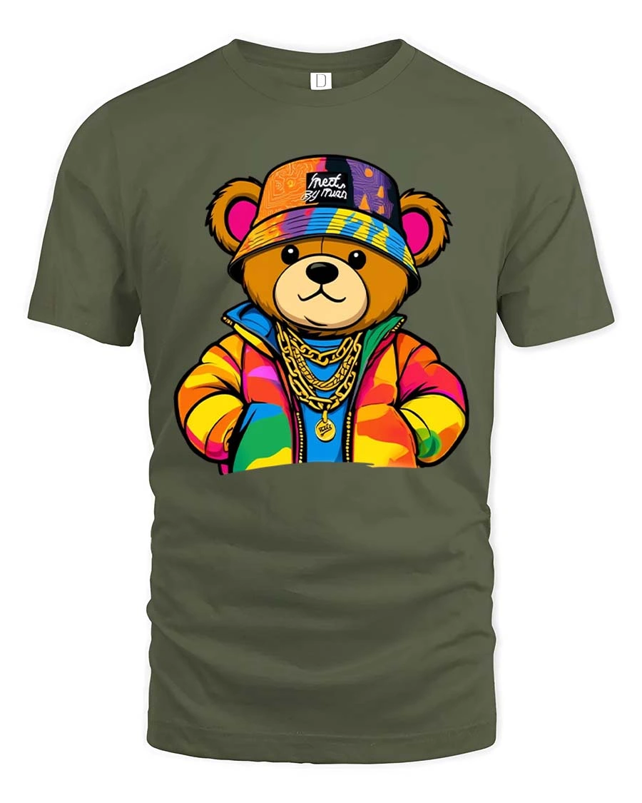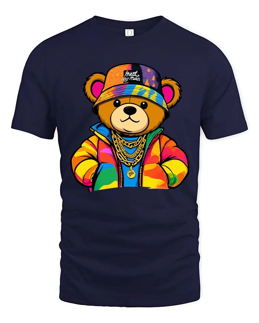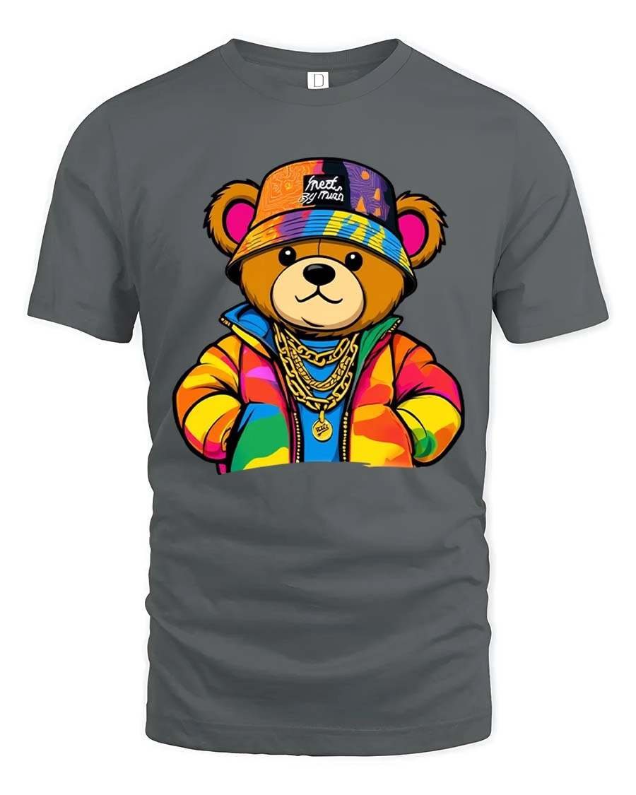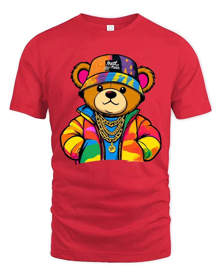 The design features a confident teddy bear dressed in colorful streetwear with chains and a bold attitude.