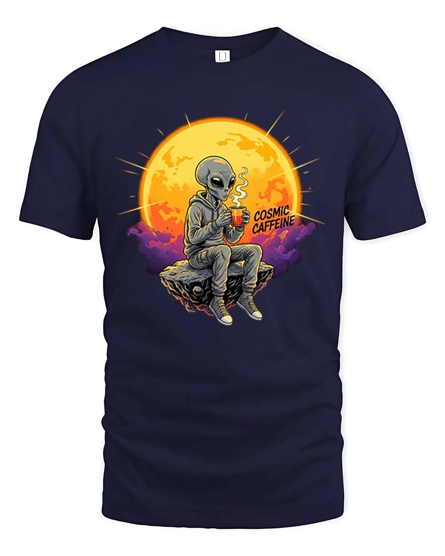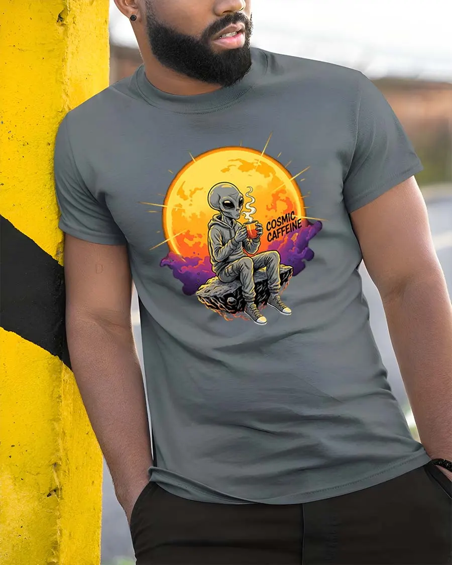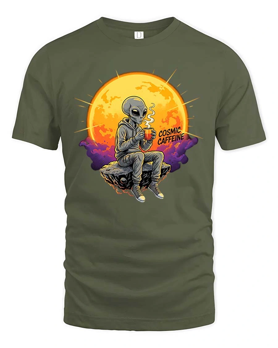 Cosmic Caffeine Alien Coffee Space Vibes Graphic Tshirt is a great choice for coffee lovers and fans of sci fi themes.