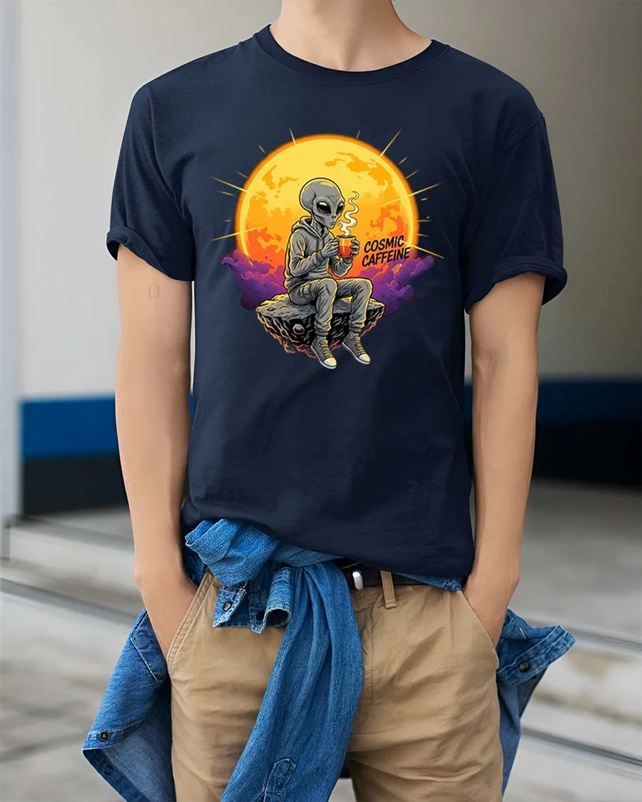 Cosmic Caffeine Alien Coffee Space Vibes Graphic Tshirt blends humor and imagination into a standout design.