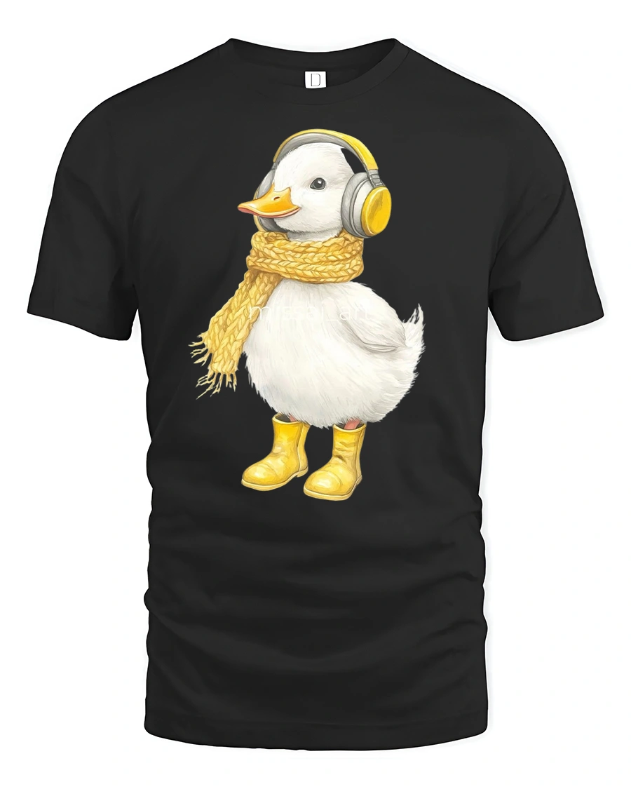 Featuring an adorable white duck wearing yellow boots, a knitted scarf, and matching headphones, this tee is perfect for anyone who loves cute and quirky animal designs.
