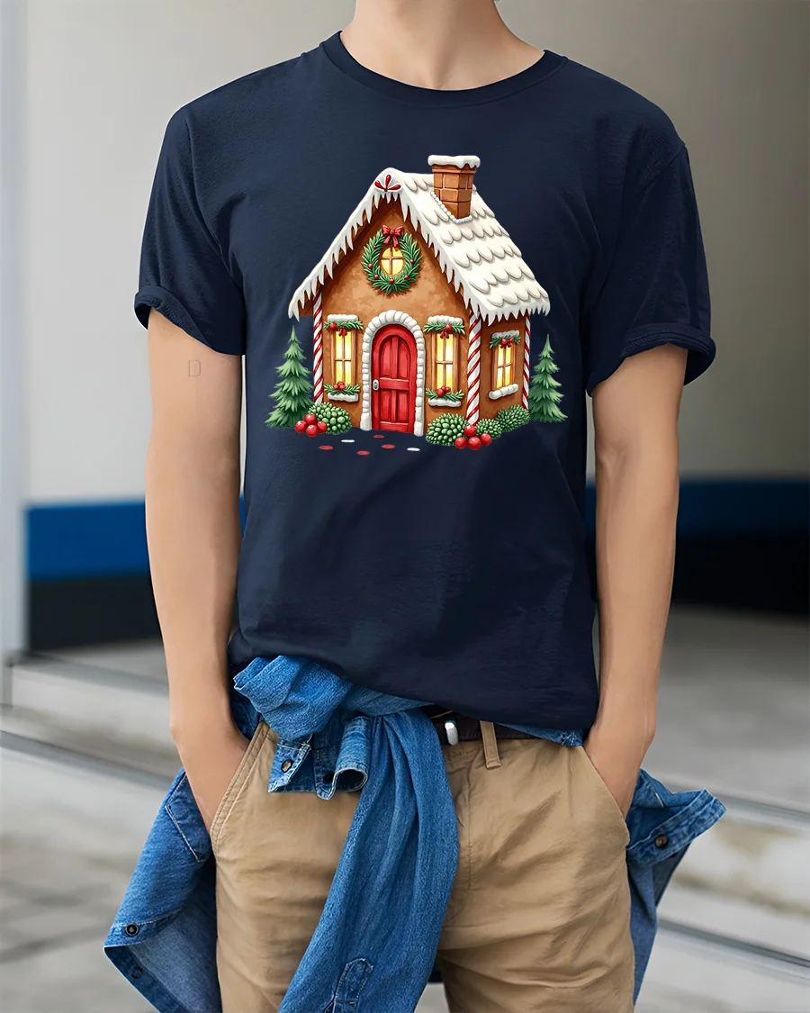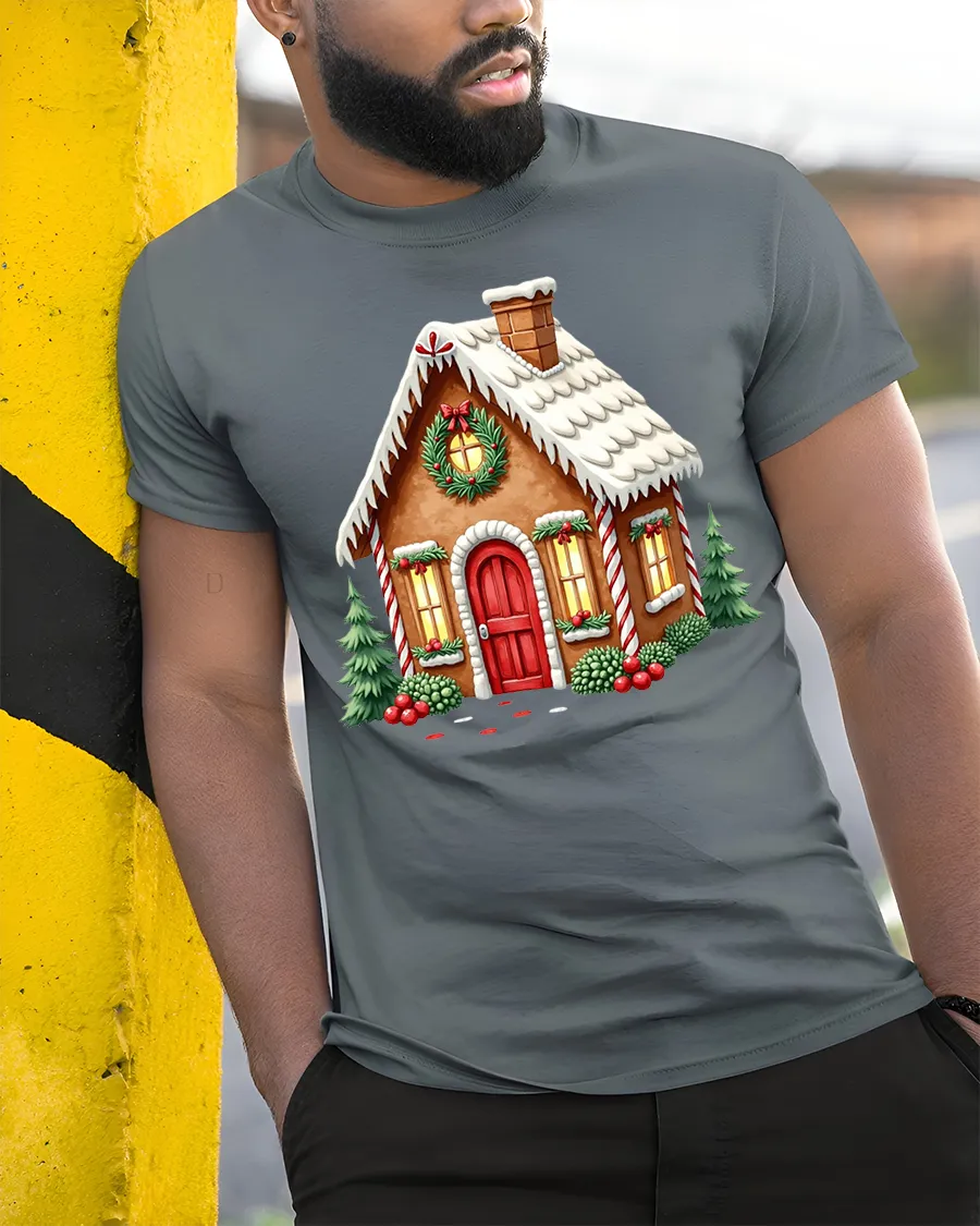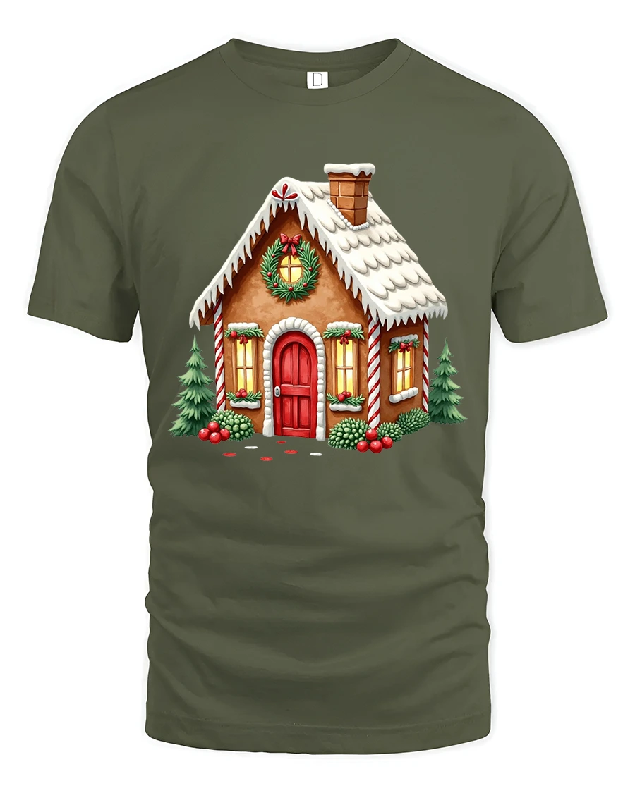 This Cozy Gingerbread Christmas House Holiday Magic Graphic Tee brings warm seasonal charm to life with a beautifully illustrated gingerbread cottage covered in snowy frosting. The glowing windows, red door, peppermint pillars, and festive wreath create a nostalgic holiday feeling that instantly brightens the mood. The playful details, from candy accents to evergreen trees, make this tshirt a delightful celebration of classic Christmas cheer.