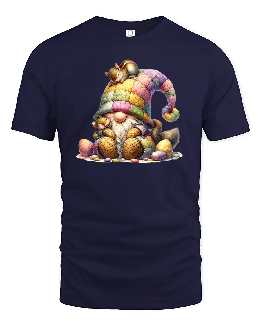 Cozy Gnome and Squirrel Tee – Cute Easter Egg T-Shirt brings cheerful spring vibes to your wardrobe. This adorable design features a sleepy gnome in a rainbow hat surrounded by Easter eggs and a snuggling squirrel on top. Perfect for anyone who loves cute, cozy, and colorful prints, this tee captures the warm spirit of the season.
