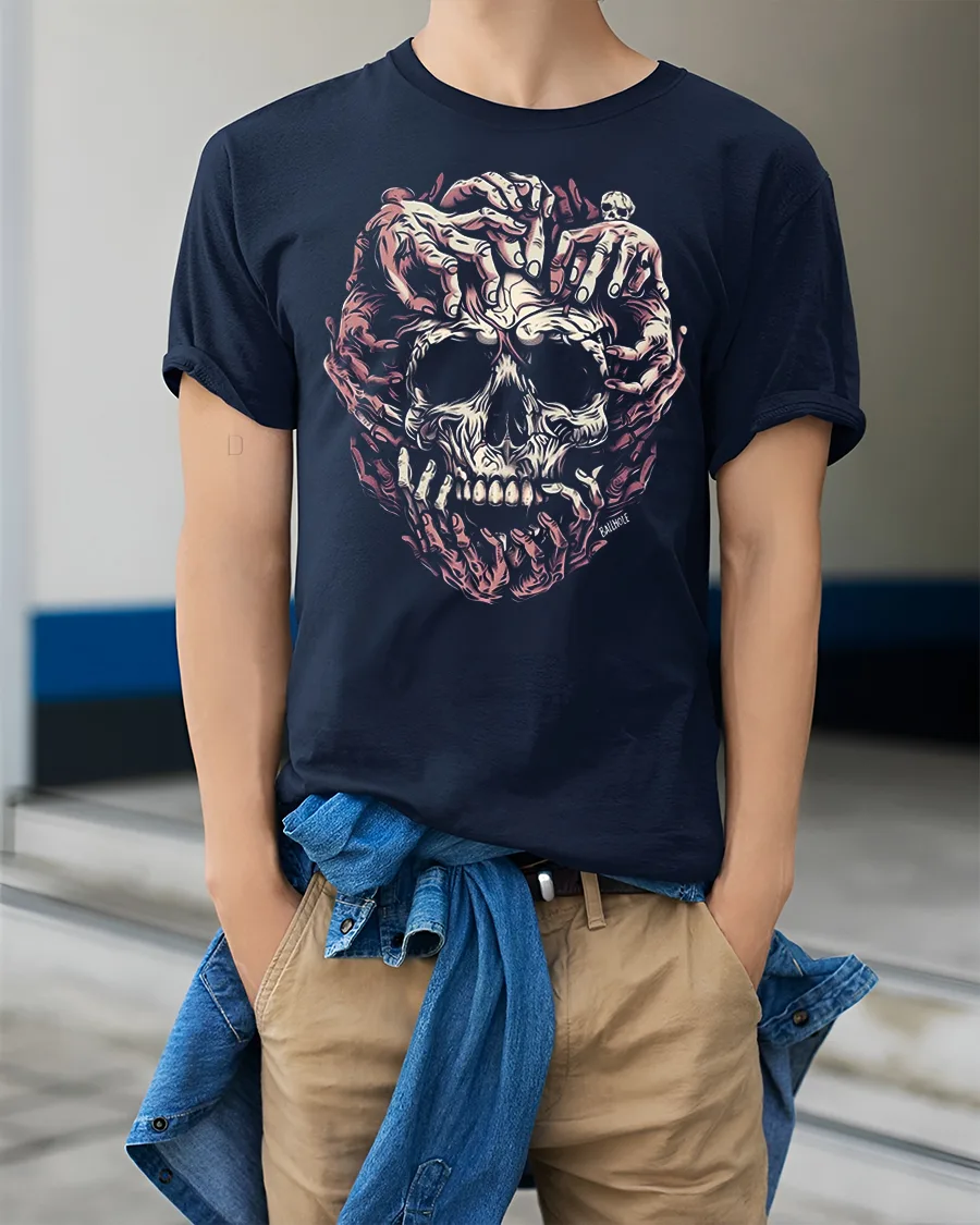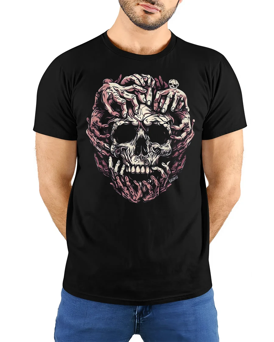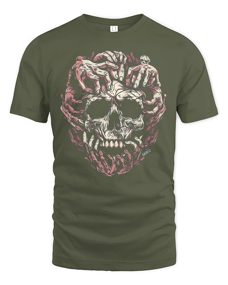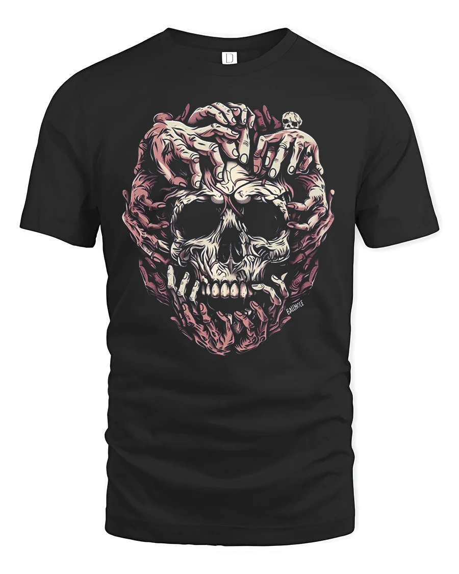 Creeping Hands Skull Art Graphic Tee With Dark Horror Style delivers an intense and unsettling visual that instantly captures attention. The design features a detailed skull surrounded by dozens of grasping hands, creating a sense of tension and eerie movement. The twisted fingers, dramatic shadows, and distressed linework add depth and atmosphere, giving the artwork a haunting and unforgettable look. Printed with high quality detail on soft, comfortable fabric, this tee combines bold horror aesthetics with everyday wearability.