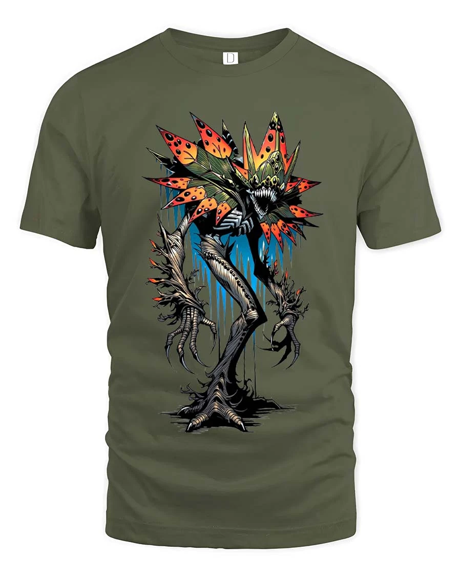 Creepy Flower Monster T Shirt Dark Horror Plant Graphic - military green t-shirt on white background