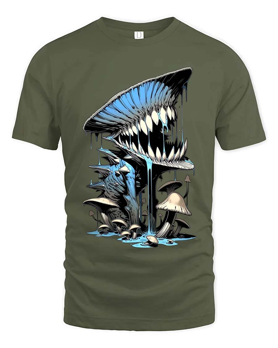Creepy Mushroom Monster Tshirt Dripping Teeth Fantasy Horror Art - military green t-shirt on white background