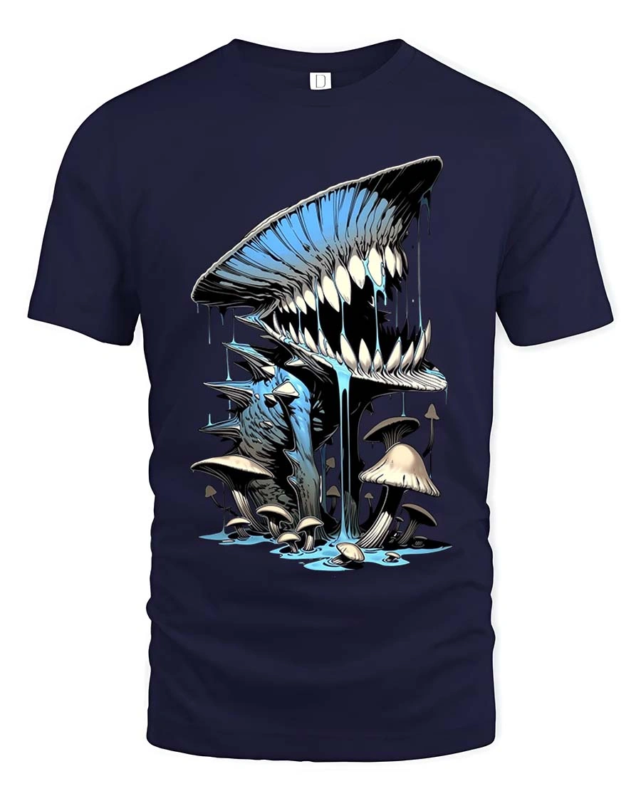 Creepy Mushroom Monster Tshirt Dripping Teeth Fantasy Horror Art - navy t-shirt on white background