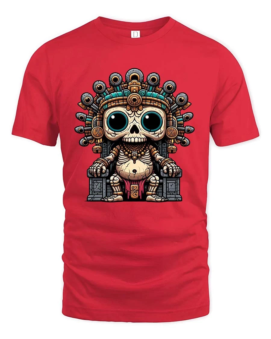 Cute Ancient Skull King Cartoon Aztec Style Graphic T Shirt - red t-shirt on white background