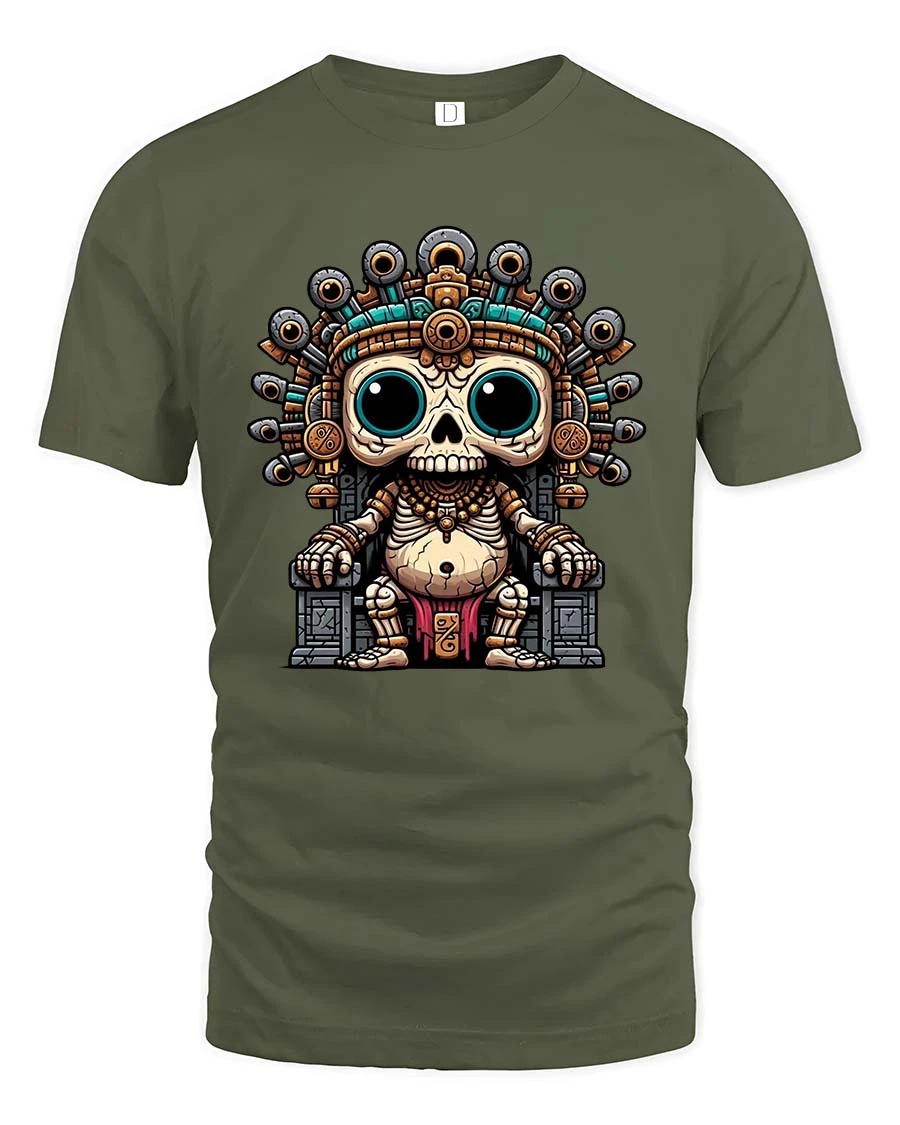 Cute Ancient Skull King Cartoon Aztec Style Graphic T Shirt - military green t-shirt on white background