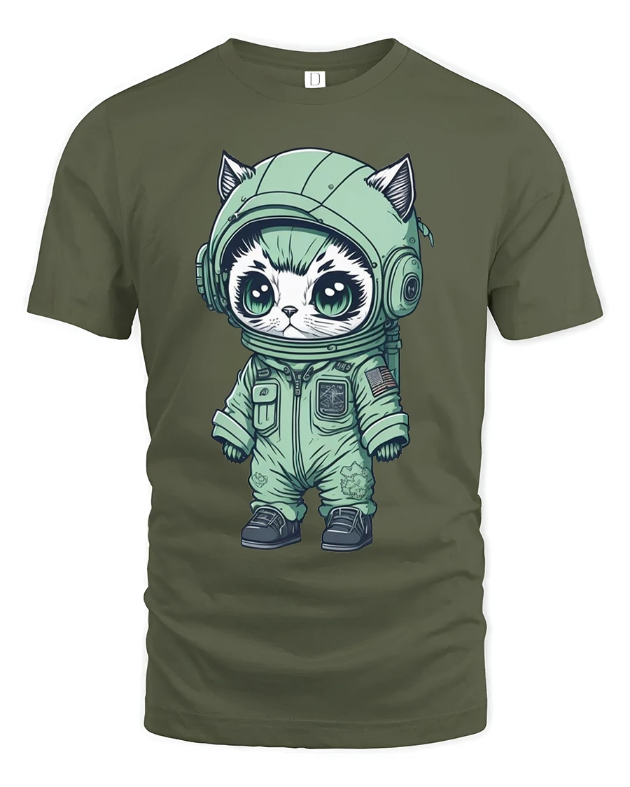 Cute Astronaut Cat Space Suit Cartoon Art Graphic T Shirt - military green t-shirt on white background