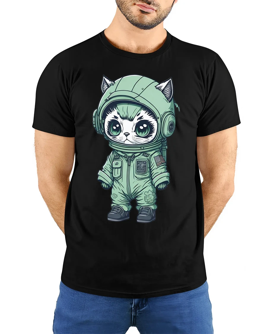 The space themed cat illustration adds personality to any casual outfit, making it easy to style with jeans, shorts, or layered looks.