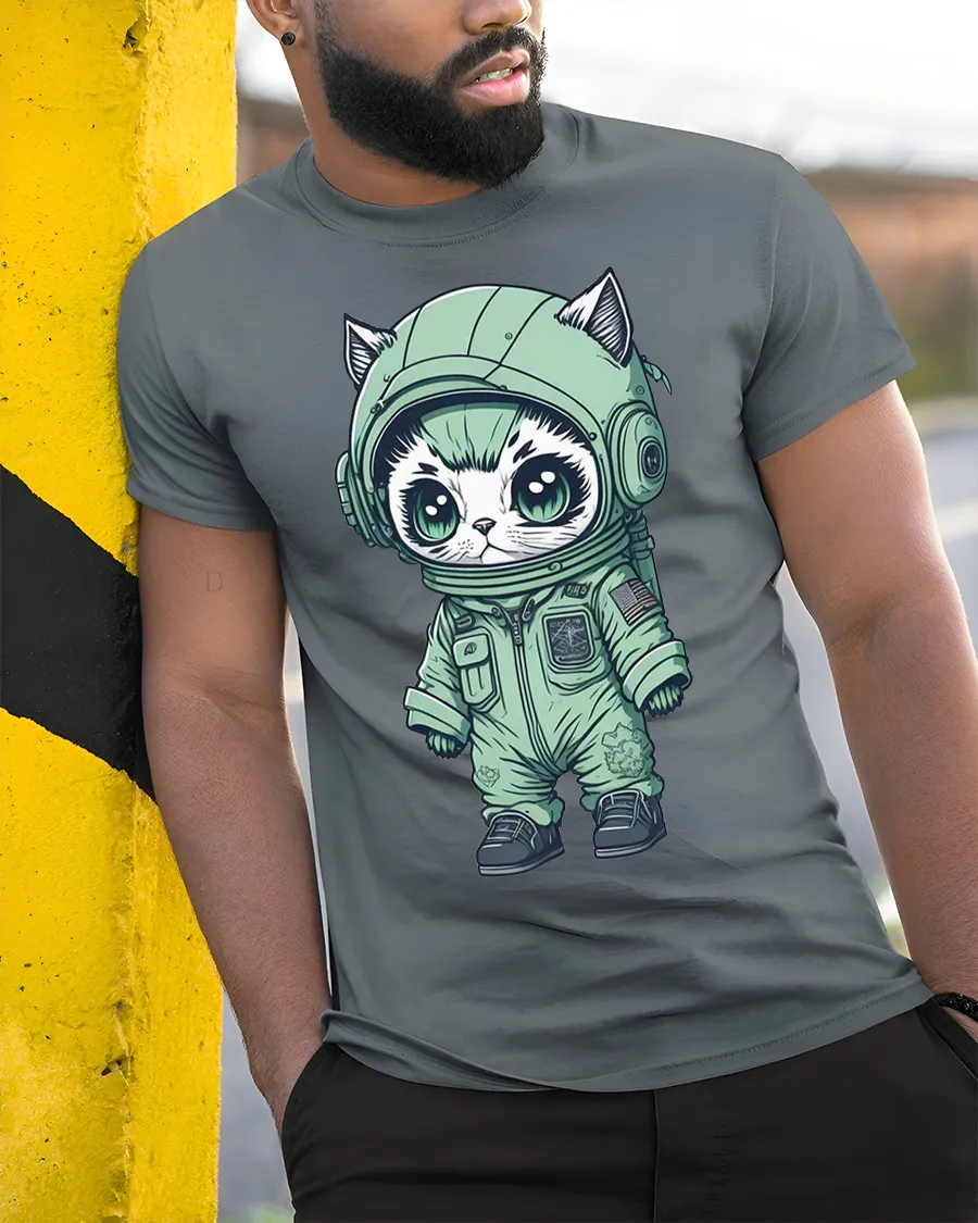Cute Astronaut Cat Space Suit Cartoon Art Graphic T Shirt - model wearing grey tee, leaning on column