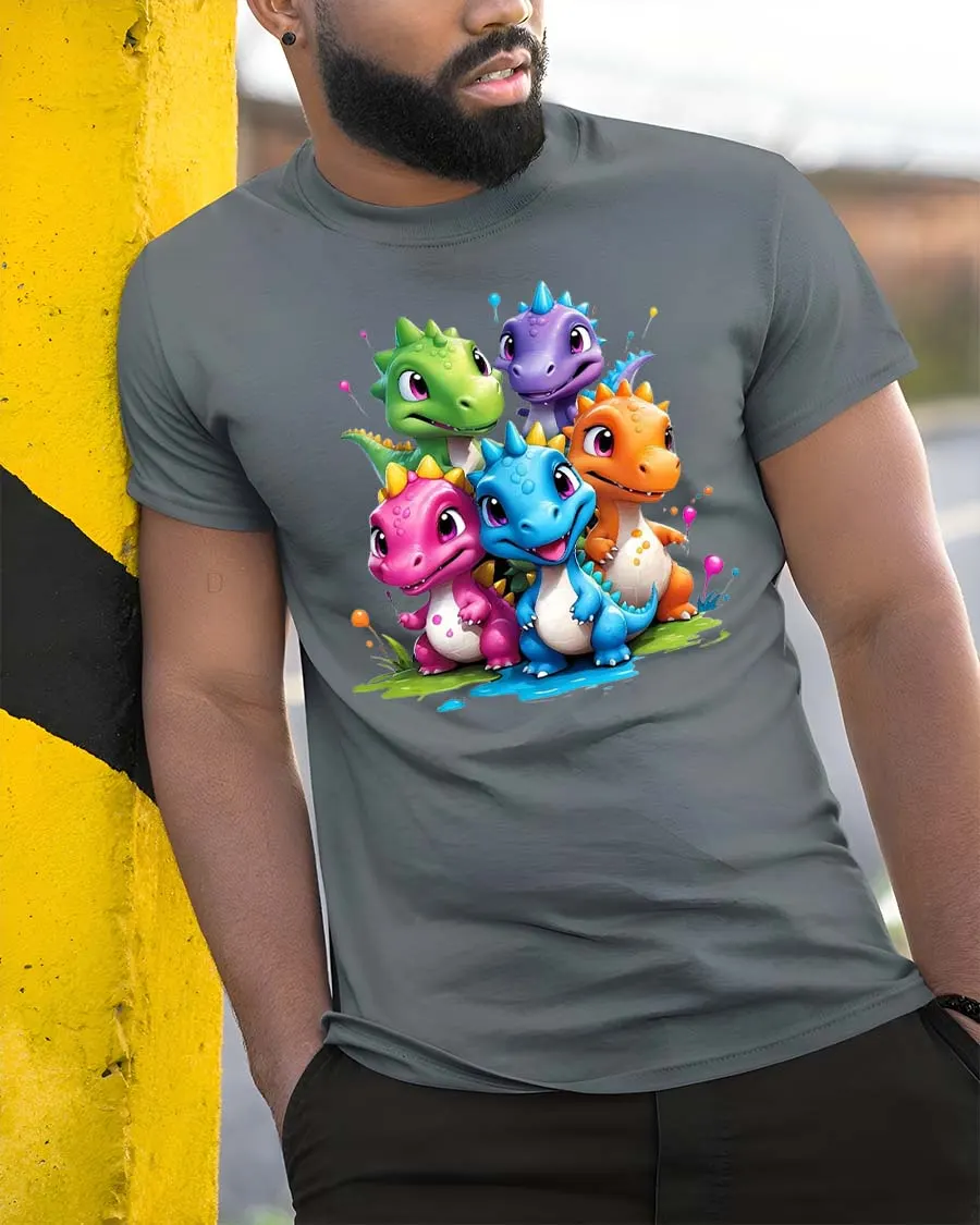 Cute Baby Dinosaur Group Graphic T Shirt Colorful Dino Friends Tee - model wearing grey tee, leaning on column