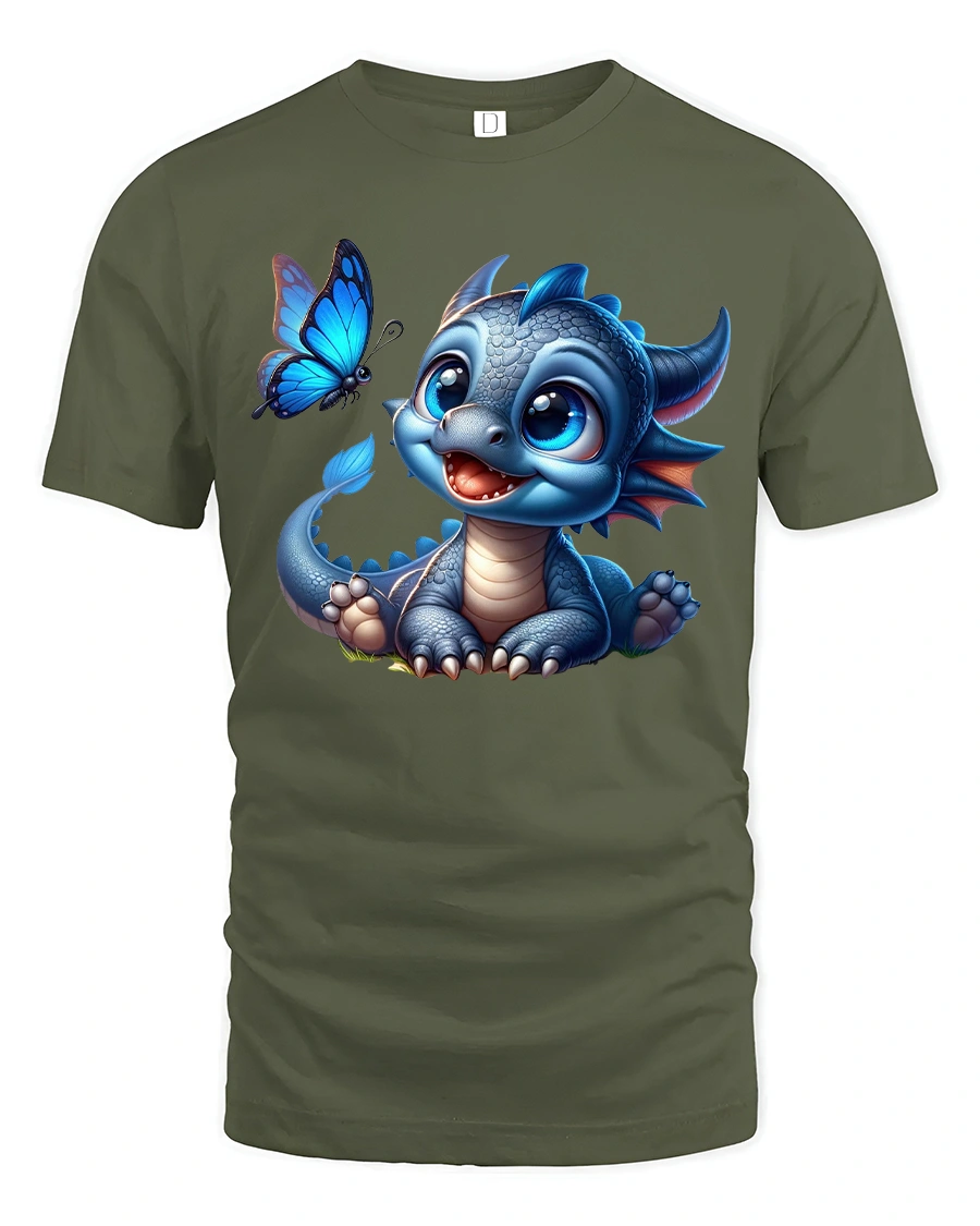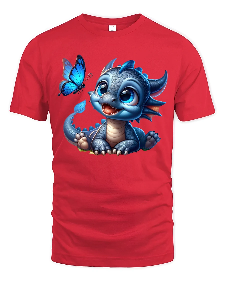 Featuring an adorable baby dragon with big sparkling eyes and a playful butterfly companion, this design creates a warm magical feeling that instantly captures attention.