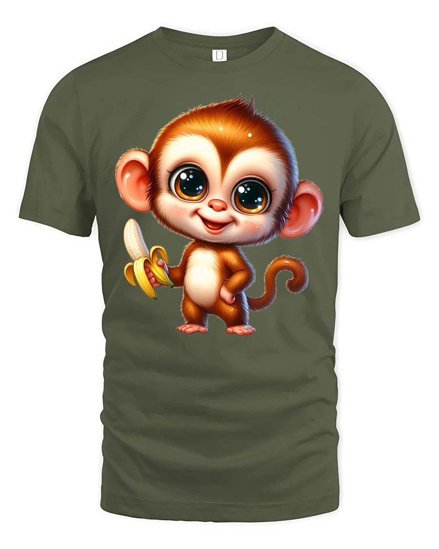 Cute Banana Monkey Tee with Big Eyes Adorable Cartoon Art - military green t-shirt on white background