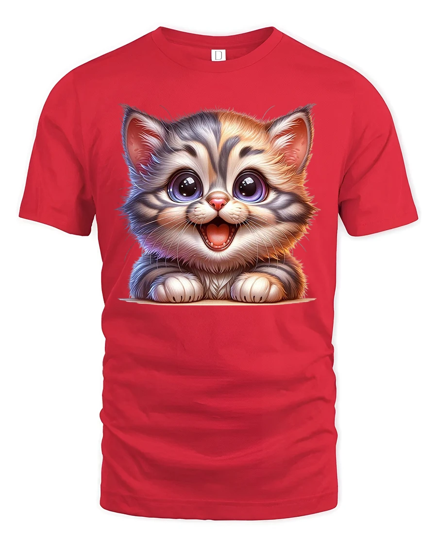 Cute Big Eyed Kitten Smiling Cartoon Cat Graphic Tshirt Art - red t-shirt on white background