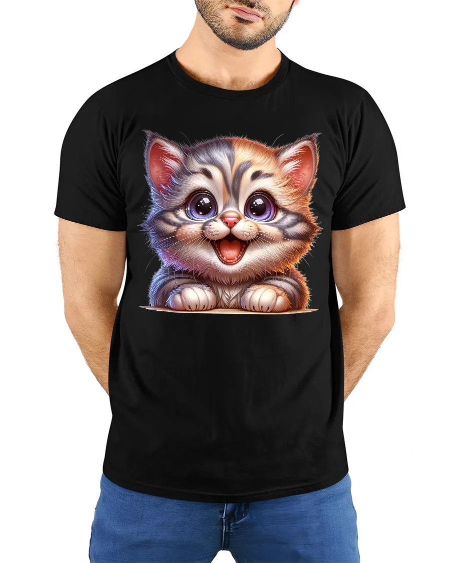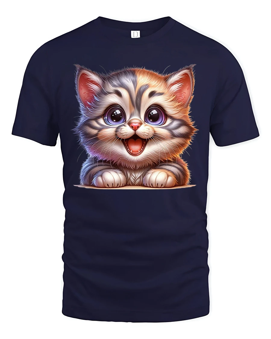 Cute Big Eyed Kitten Smiling Cartoon Cat Graphic Tshirt Art is printed with vibrant detail to highlight the kitten fur texture and bright eyes.