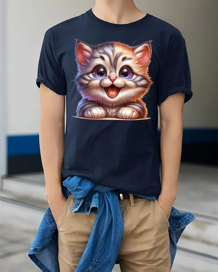 This playful artwork captures the charm of a happy kitten while adding a light and uplifting vibe to everyday outfits.