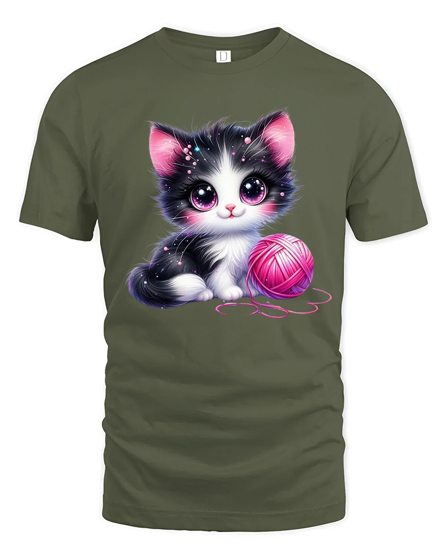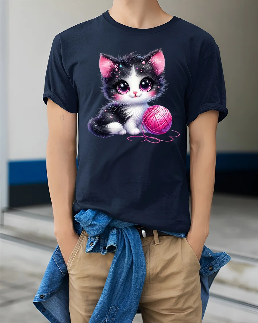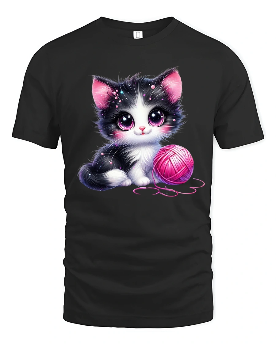 This adorable design features a big-eyed black and white kitten playing with a bright pink yarn ball, radiating pure charm and sweetness.