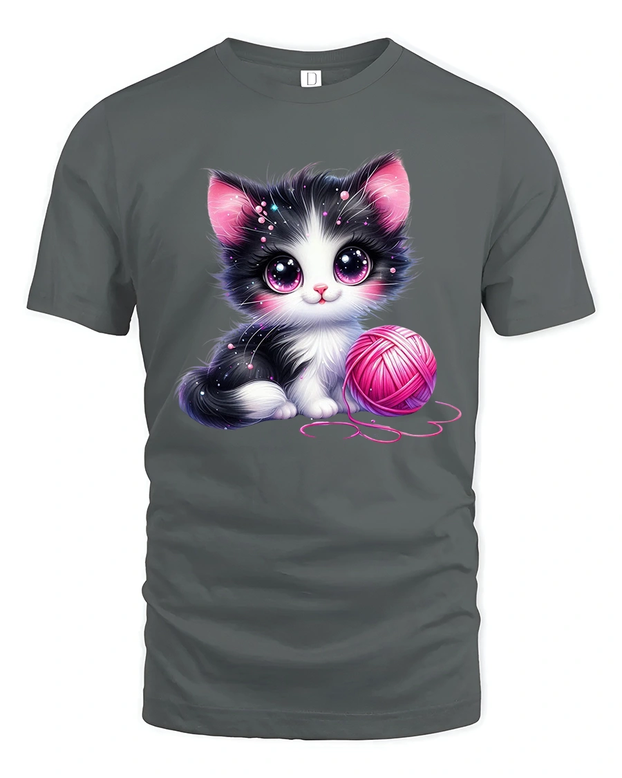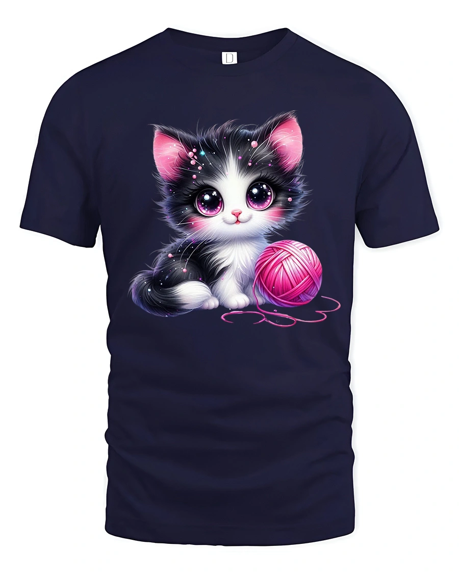 Show your love for all things soft and cuddly with the Cute Black and White Kitten with Pink Yarn Art T-Shirt.