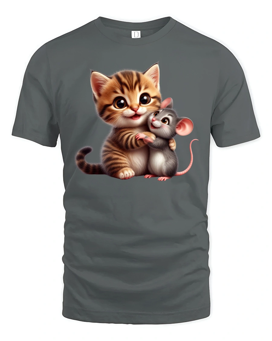 Cute Cat and Mouse Hug Tee – Adorable Friends T-Shirt captures the heartwarming charm of unlikely friendship. This design features an irresistibly cute kitten hugging a tiny mouse, both smiling with pure joy. It’s a perfect tee for anyone who loves animals, friendship, or simply spreading good vibes through fashion.