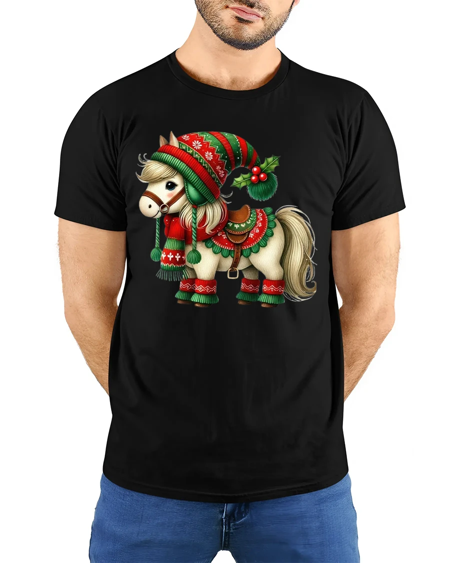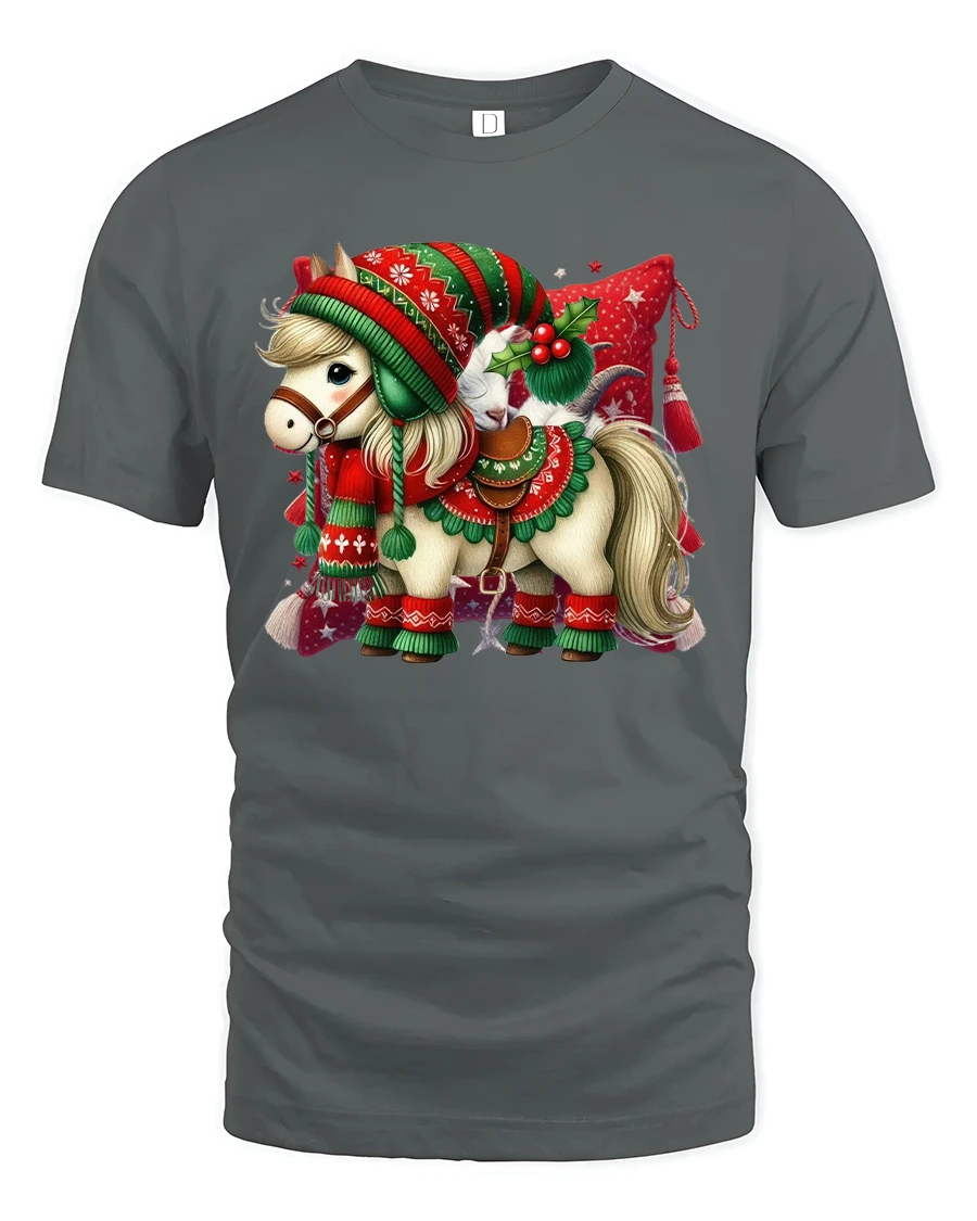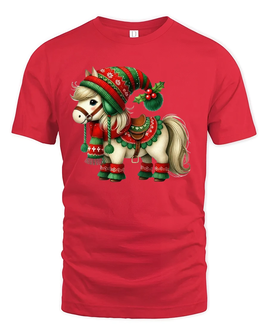 Featuring an adorable pony dressed in a red and green Christmas outfit complete with a hat and scarf, this tee captures the spirit of joy and warmth that makes the holidays special.