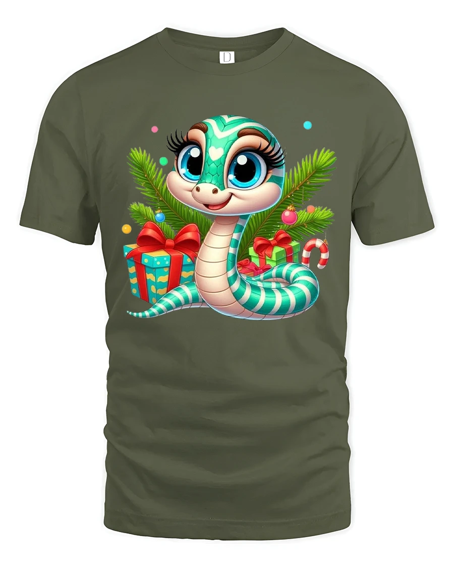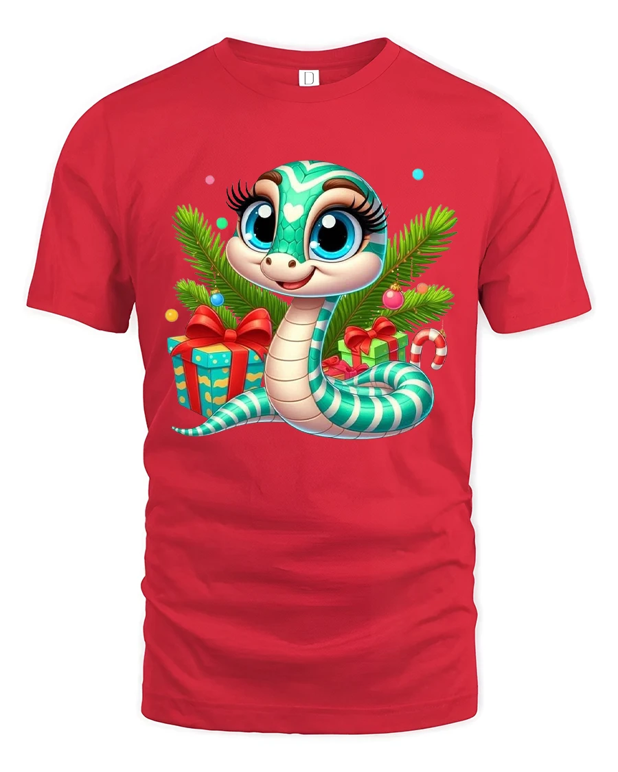 Cute Christmas Snake Tee with Gifts and Holiday Cheer Design brings playful charm and festive fun to your seasonal wardrobe. This vibrant design features an adorable big-eyed snake surrounded by colorful Christmas gifts, evergreen branches, ornaments, and candy canes. Its cheerful expression and bright striped pattern make the artwork pop beautifully, creating an eye-catching and heartwarming holiday look.
