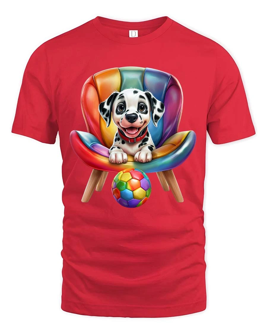 Cute Dalmatian Puppy Chair Graphic T Shirt Colorful Fun Style - red t-shirt on white background