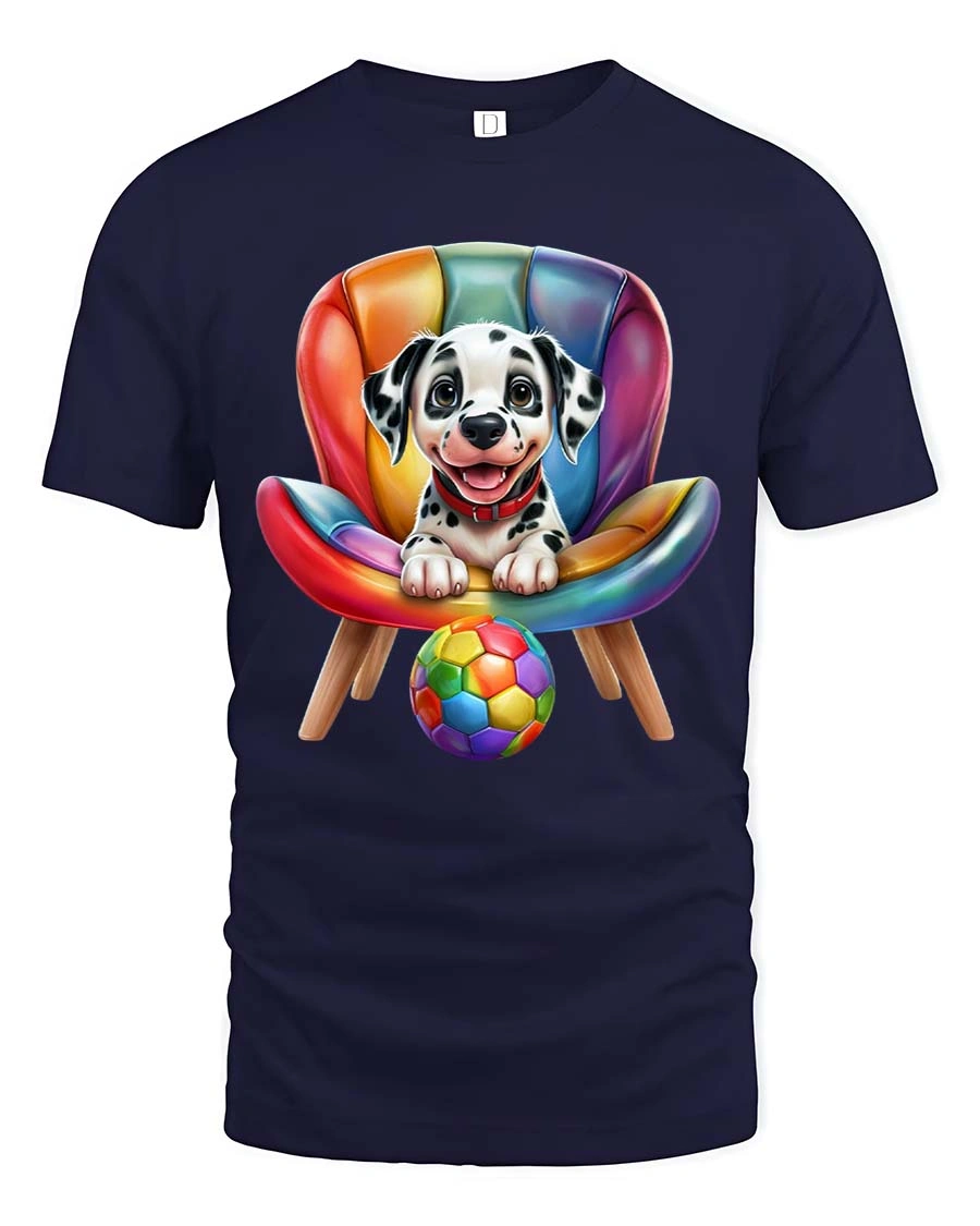 Cute Dalmatian Puppy Chair Graphic T Shirt Colorful Fun Style - navy t-shirt on white background