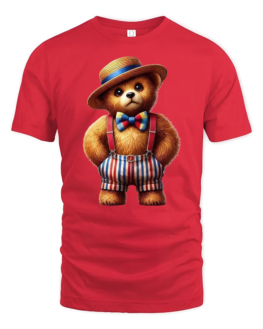 This Cute Dapper Bear Suspenders Tee Adorable Vintage Style T-Shirt features a charming bear dressed in a colorful bowtie, striped suspenders, and a classic straw hat. With rich details and warm tones, the design blends vintage fashion with playful character art, creating a fun and eye-catching look perfect for both kids and adults. The bear’s expressive face and stylish outfit give the graphic a personality that stands out beautifully on any casual outfit.