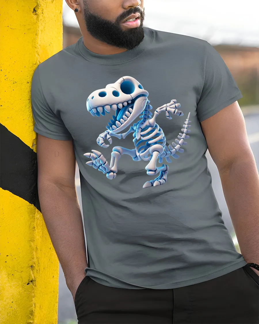 Cute Dino Skeleton Cartoon T-Rex Fun Graphic Tee - model wearing grey tee, leaning on column