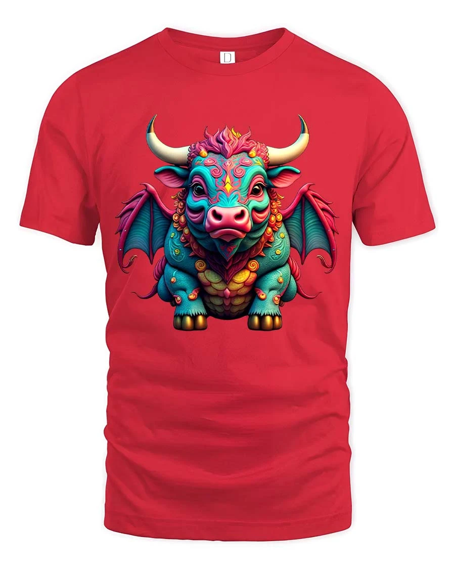 Cute Fantasy Dragon Cow Hybrid Cartoon Art T Shirt - red t-shirt on white background