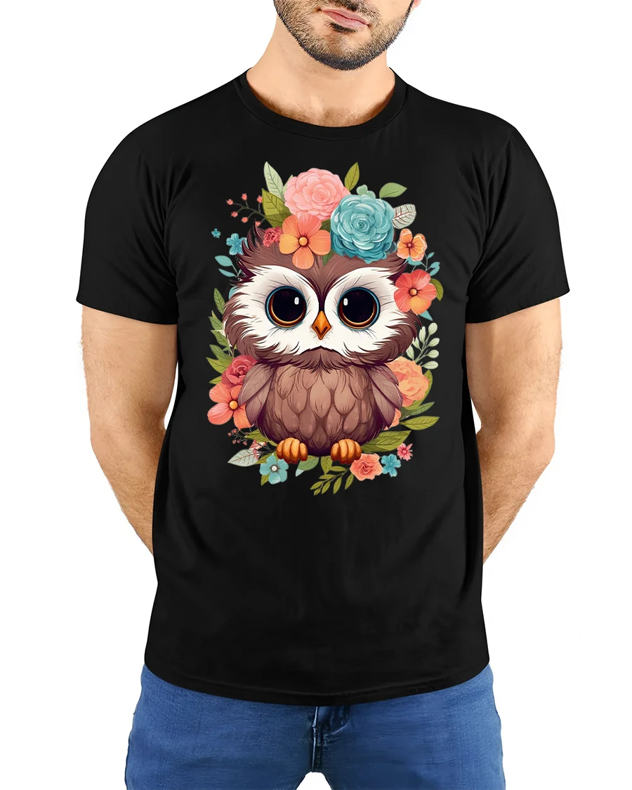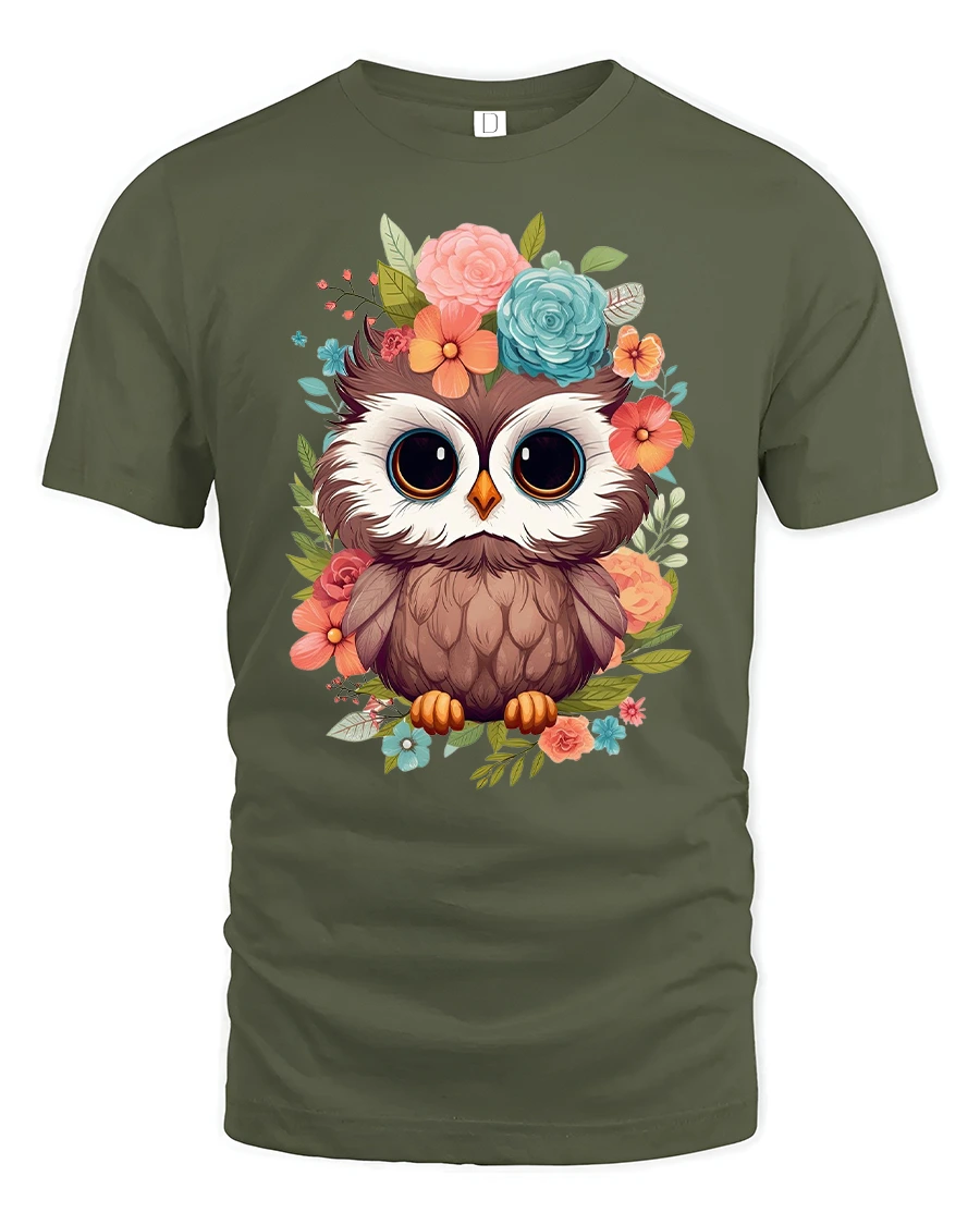 Cute Floral Owl Big Eyes Whimsical Art Graphic Tshirt brings sweetness warmth and gentle charm into everyday fashion.